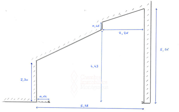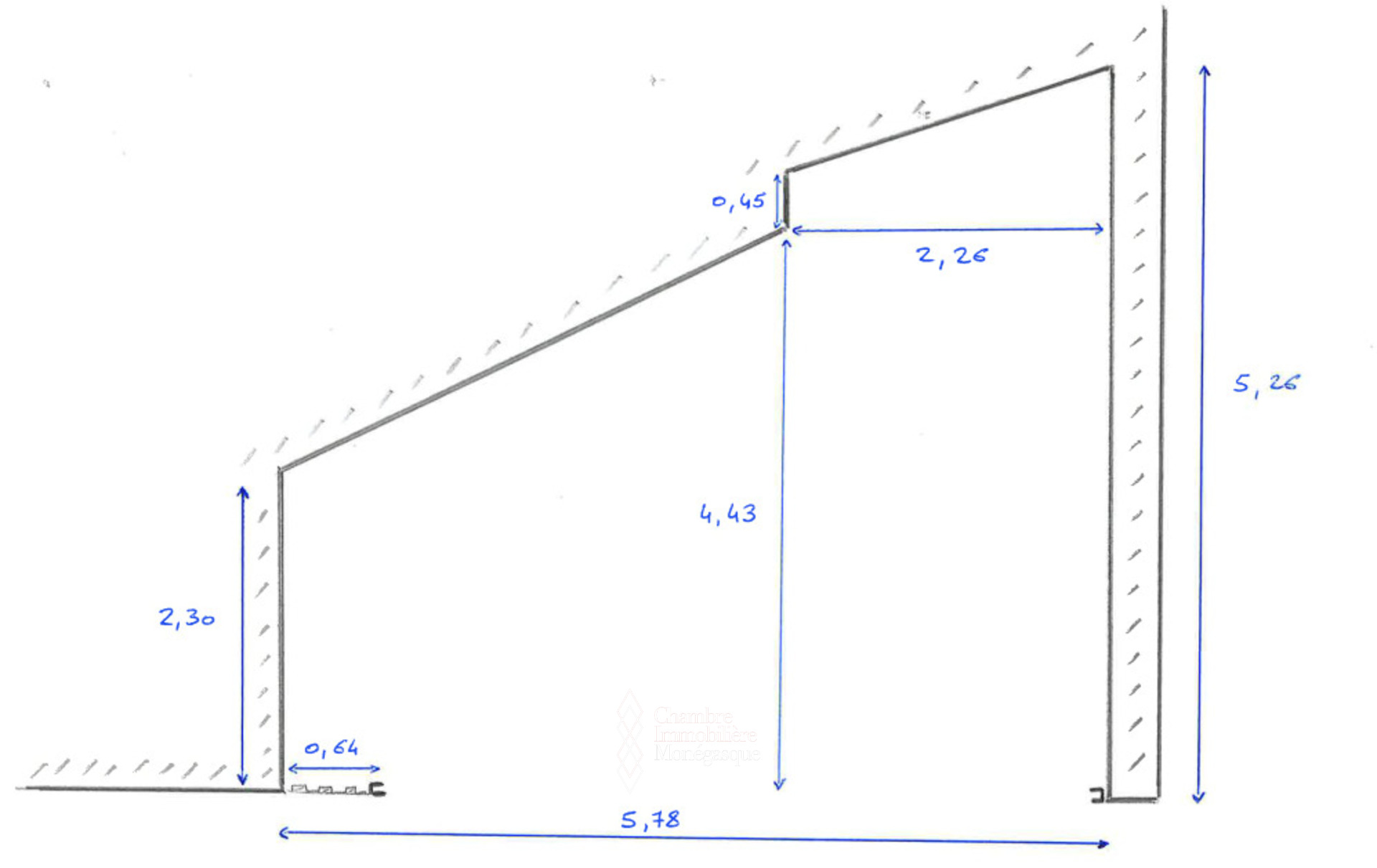 Dimensions: Longueur 5m + 0,70cm mur ouverture entrée garage x largeur environ 5,20m sur le coté droit et 2.30m coté gauche,