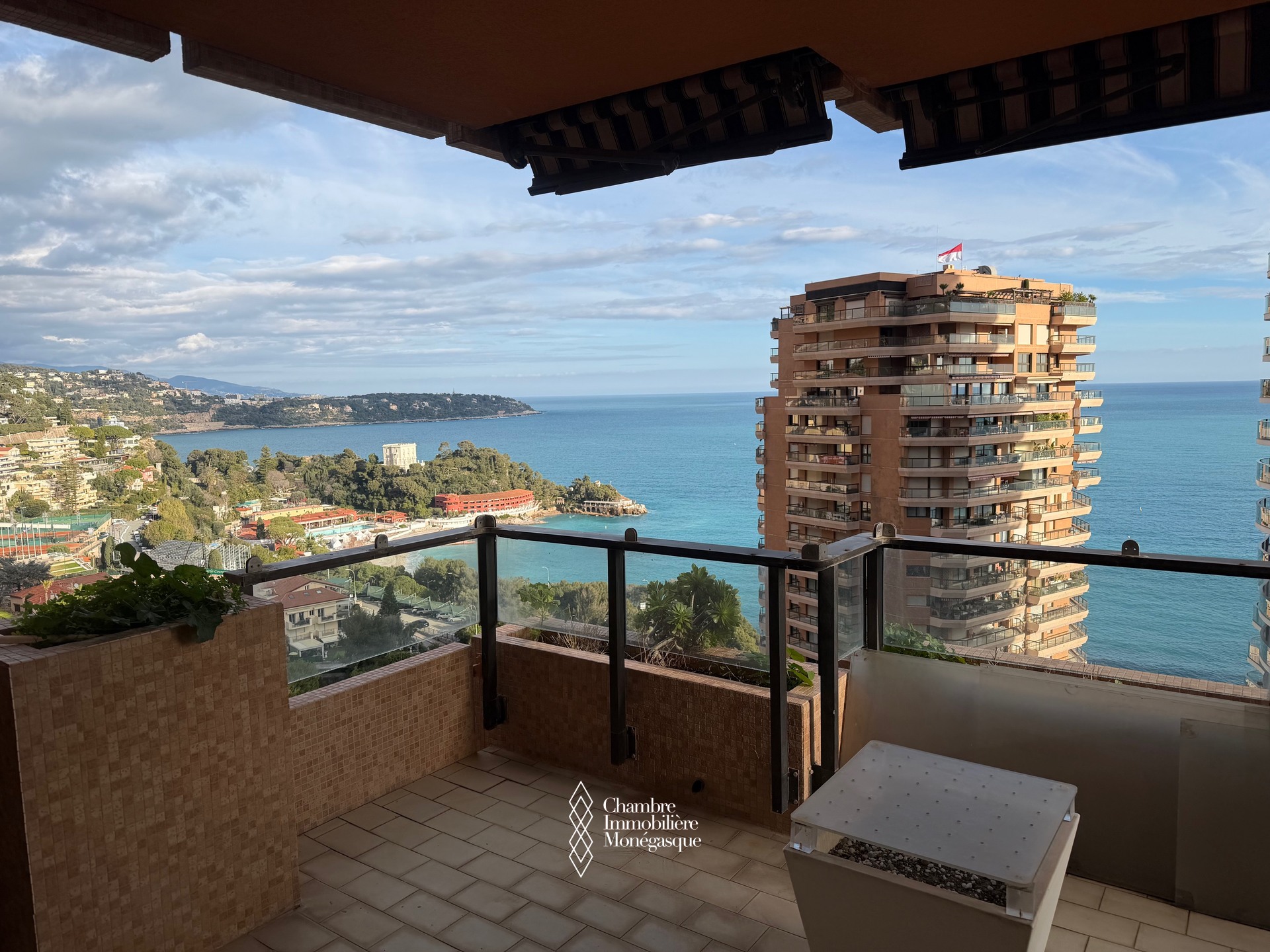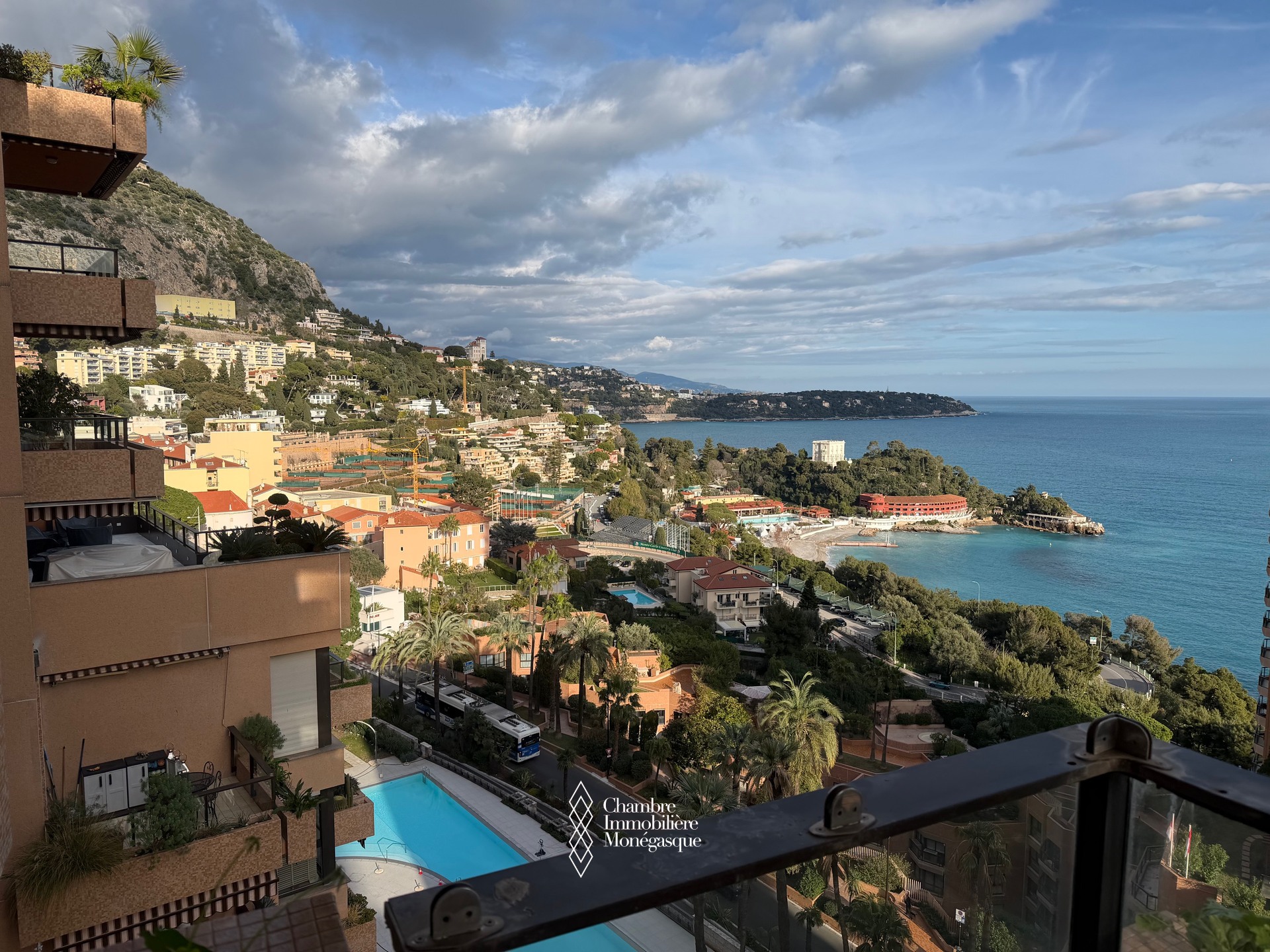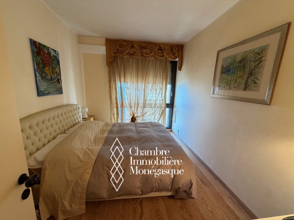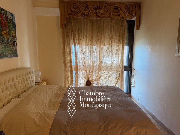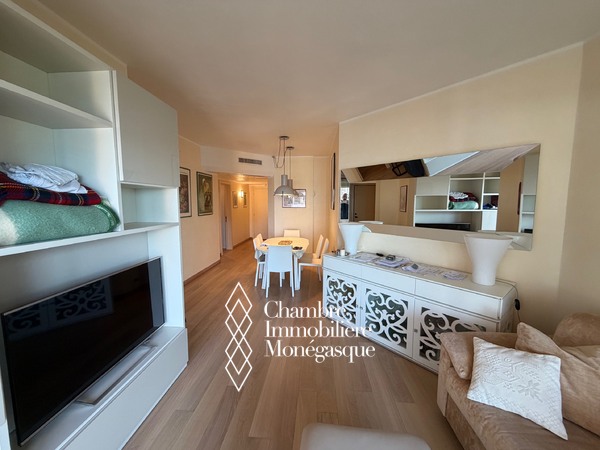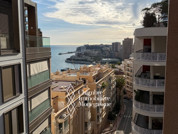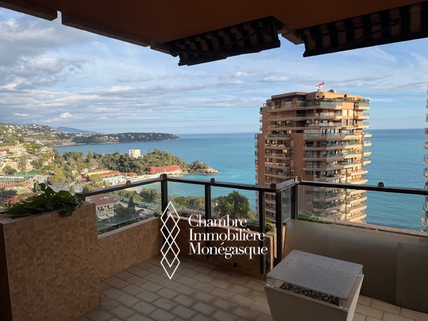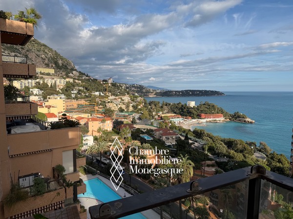 Dans une résidence avec piscine, jardin et conciergerie 24h/24 superbe 2 pièces en étage élevé avec vue mer panoramique sur la mer , la piscine et le port de monaco.