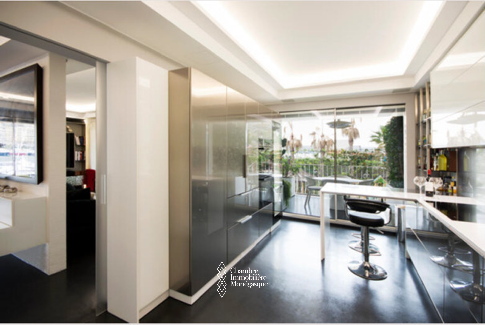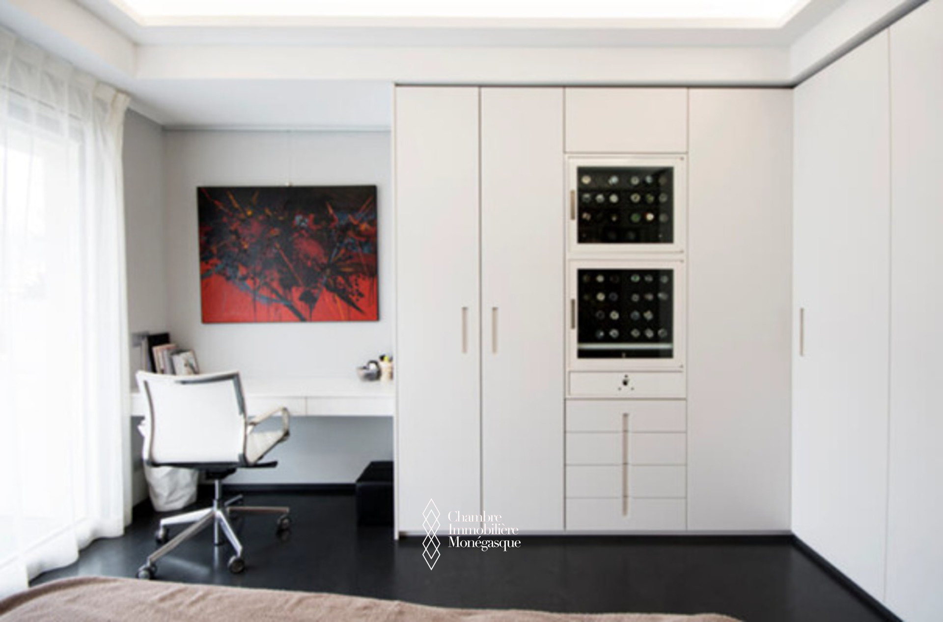 Ce bureau de 4 pièces est formé par la réunion de deux unités. Il a récemment fait l’objet d’importants travaux de rénovation. La décoration de style contemporain comprend toutes les menuiseries sur mesure réalisées par des artisans italiens, système d’alarme et de caméras, chauffage et climatisation indépendants, chauffage extérieur permettant de profiter de la terrasse toute l’année, système de musique Sonos.