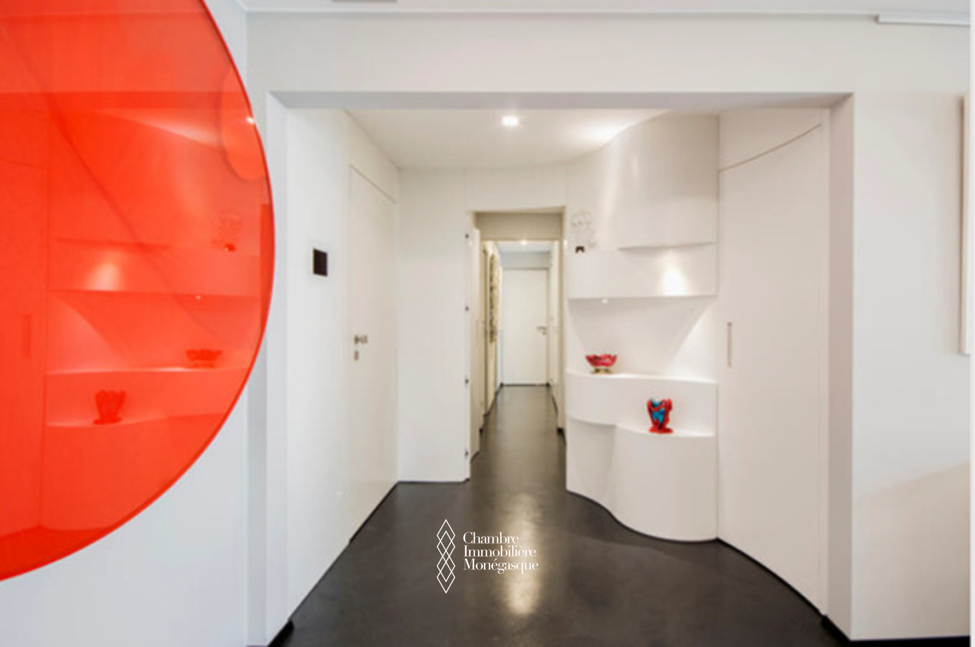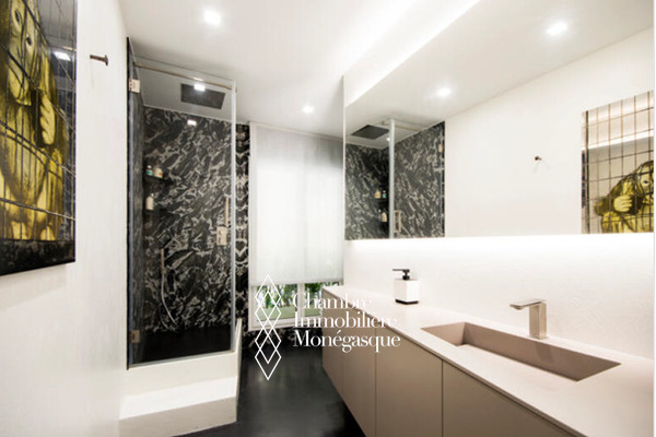 Il est actuellement utilisé comme appartement et distribué comme il suit : entrée avec vestiaire, un grand espace principal avec une séparation pour créer deux espaces différents, cuisine, débarras, toilettes invités, balcon vers le Fort Antoine, balcon vers le Port Hercule et la ville, 3  autres espaces de travail separés, 3 salles de bains et de nombreux placards. Une cave et  un box de parking fermé complètent ce bien.