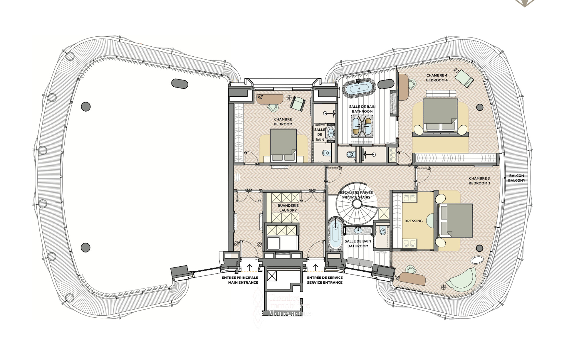 Étage inférieur: hall d’entrée, salon spacieux, salle à manger donnant sur une immense terrasse circulaire, bureau, entrée de service avec rangement, cuisine équipée indépendante, 2 chambres avec dressing attenant et salles de bains/douche s’ouvrant sur une terrasse spacieuse, wc d'invité