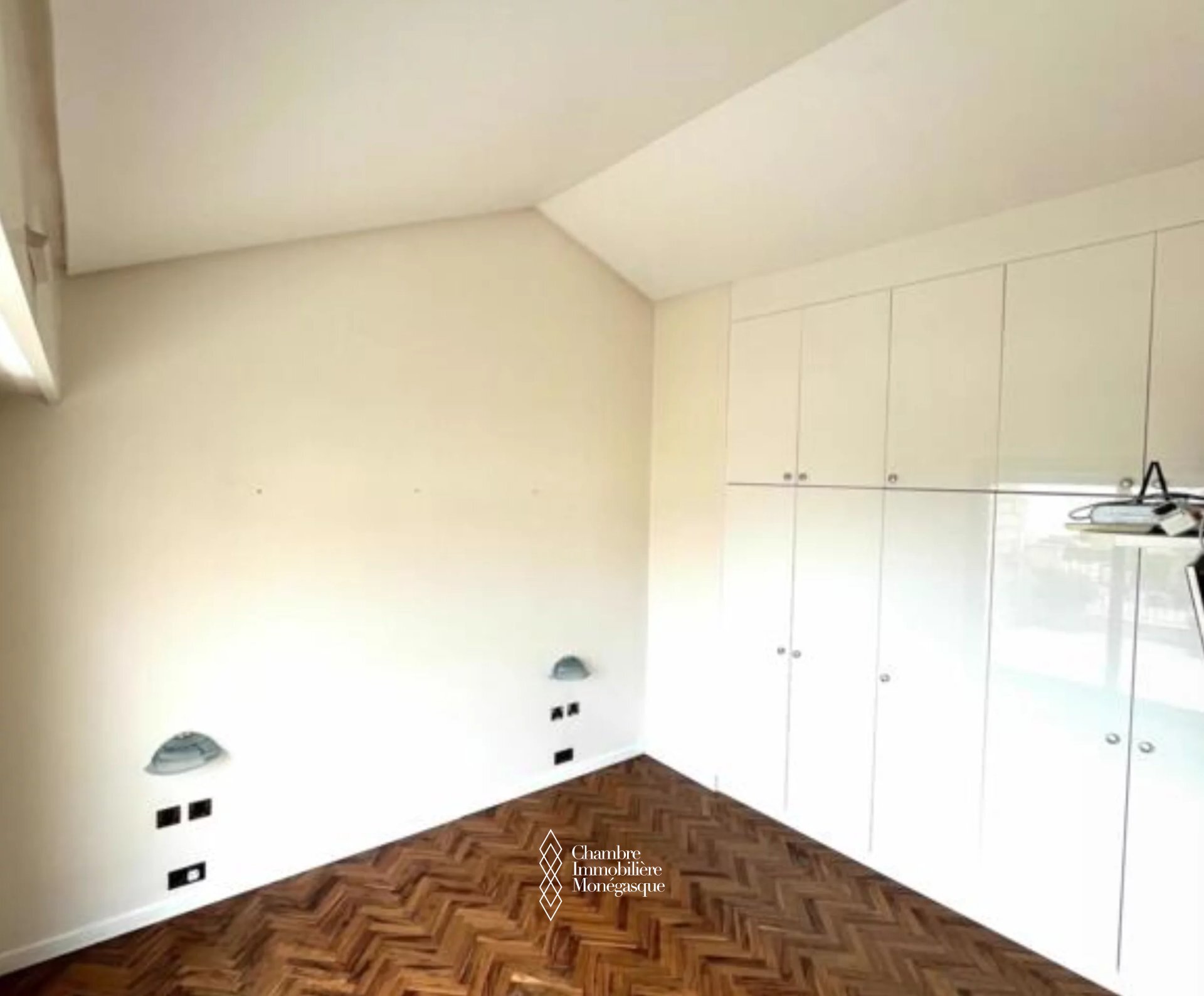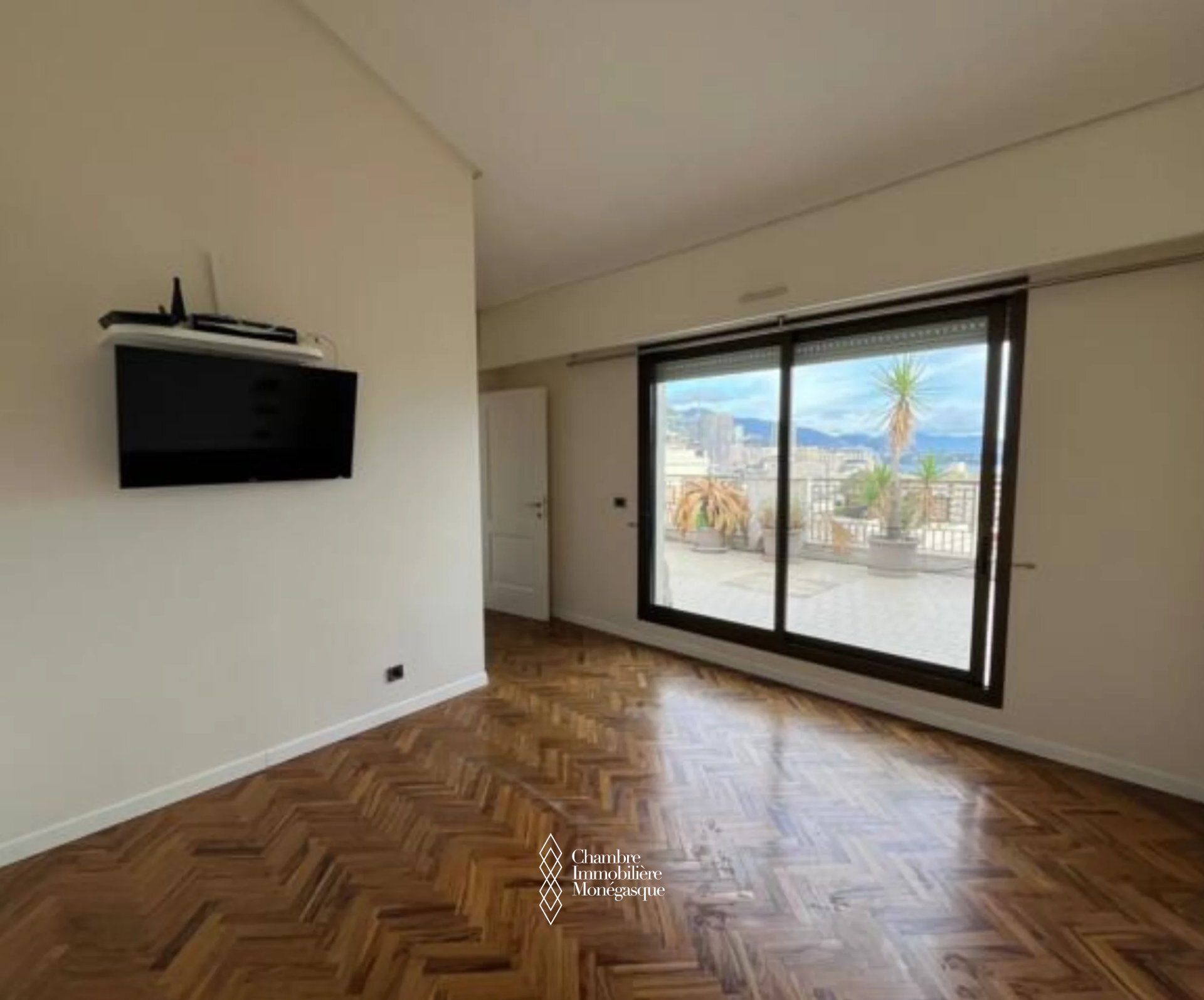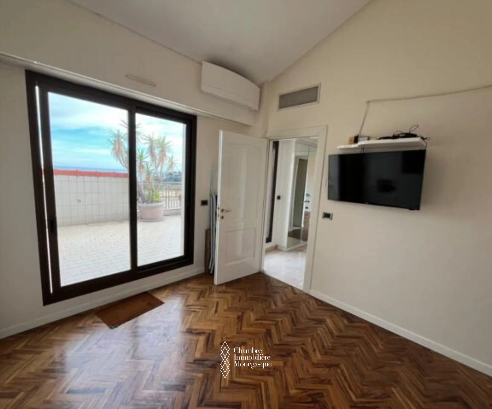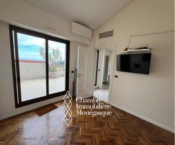 À l’étage supérieur, dernier niveau de l’immeuble, se trouve une splendide suite parentale avec salle de bains privative et large baie vitrée donnant accès à une grande terrasse. La vue y est remarquable, offrant un panorama dégagé sur la mer, le Rocher et Roquebrune. Une seconde chambre, lumineuse et traversante, bénéficie également de sa salle de bains en suite, d’une fenêtre avec vue mer ainsi que d’un accès à un balcon situé à l’arrière. Les volumes sont sublimés par une belle hauteur sous plafond, apportant luminosité et sensation d’espace.