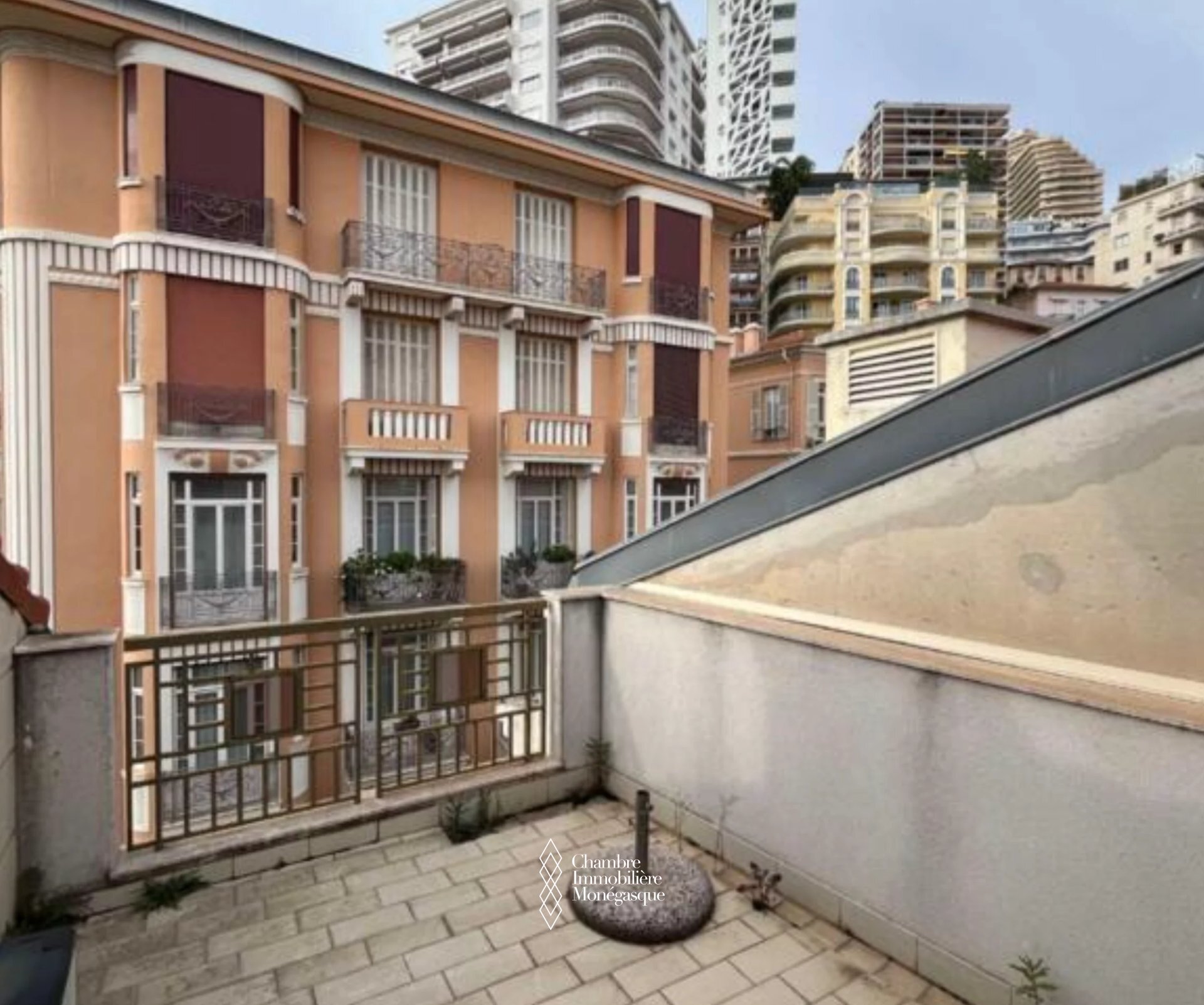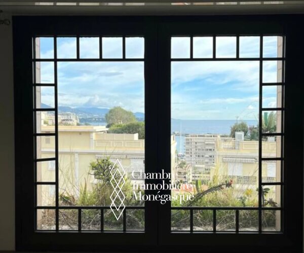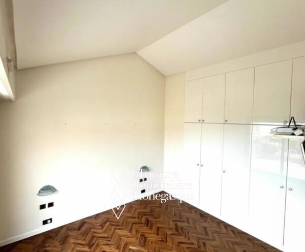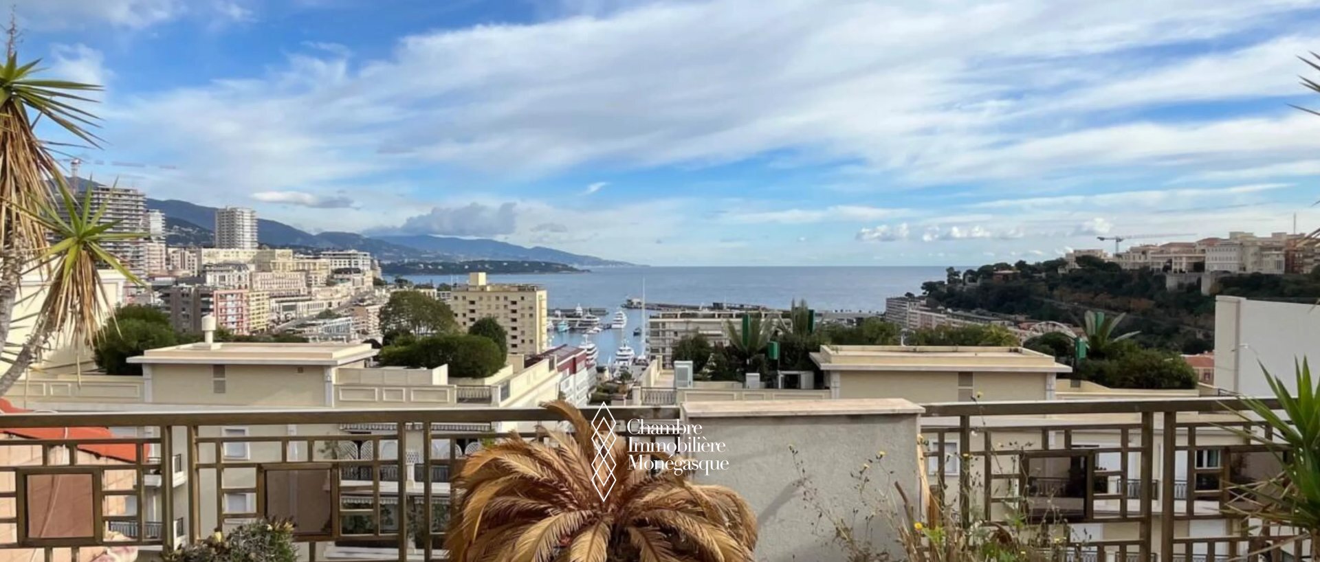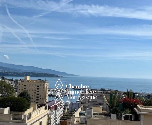À l’étage supérieur, dernier niveau de l’immeuble, se trouve une splendide suite parentale avec salle de bains privative et large baie vitrée donnant accès à une grande terrasse. La vue y est remarquable, offrant un panorama dégagé sur la mer, le Rocher et Roquebrune. Une seconde chambre, lumineuse et traversante, bénéficie également de sa salle de bains en suite, d’une fenêtre avec vue mer ainsi que d’un accès à un balcon situé à l’arrière. Les volumes sont sublimés par une belle hauteur sous plafond, apportant luminosité et sensation d’espace.
