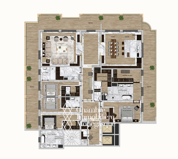 Orienté plein sud, cet appartement exceptionnel bénéficie d’un accès privé par ascenseur. Hall d’entrée menant à un salon et une salle à manger décloisonnés, une cuisine américaine et une grande terrasse donnant sur le jardin exotique et la mer Méditerranée. Suite parentale avec sa salle de bains en marbre luxueusement conçue et aménagée et un beau dressing, suites de 3 chambres avec accès direct à une spacieuse terrasse circulaire. Buanderie supplémentaire, vestiaire invités, beaucoup de placards et de rangement.