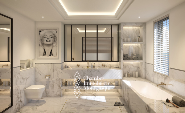 Exceptionnel appartement rénové orienté plein sud dans le quartier calme de Fontvieille, avec des intérieurs luxueux et spacieux.
