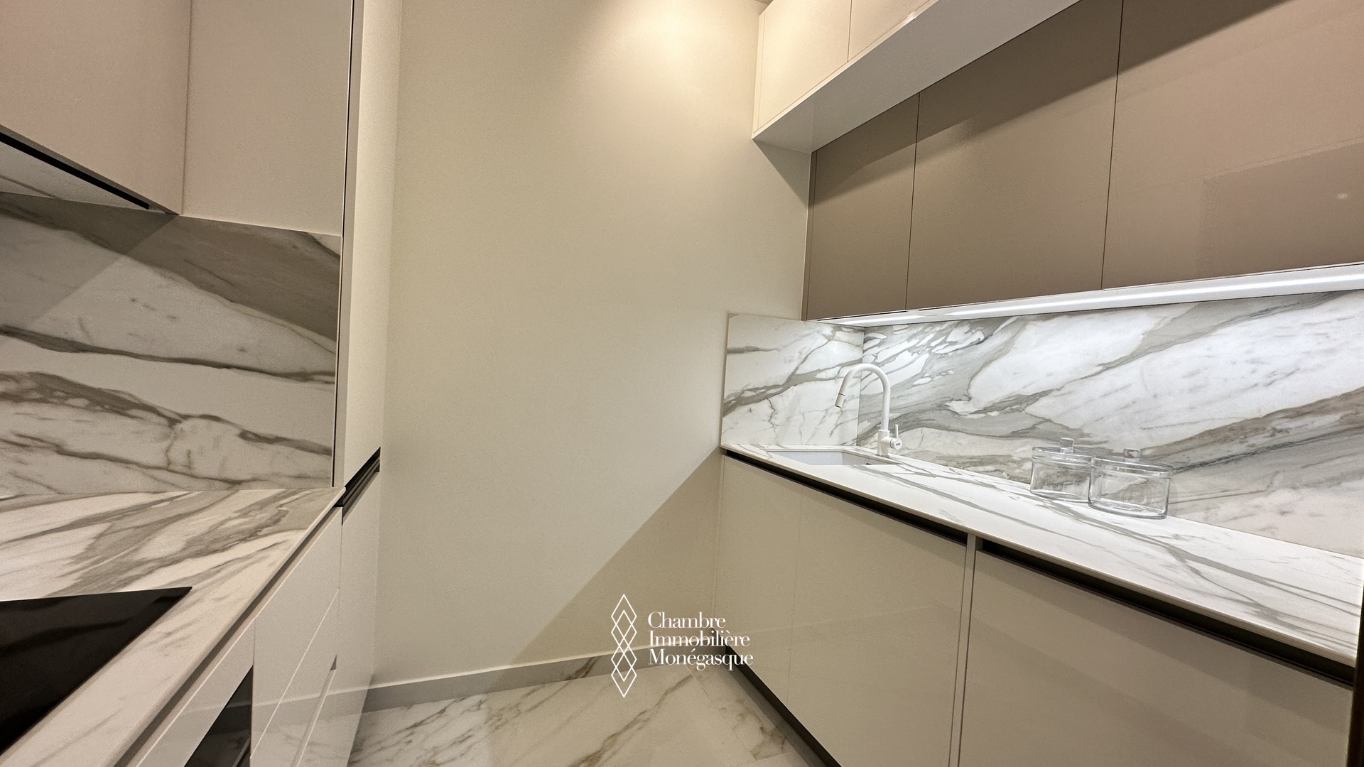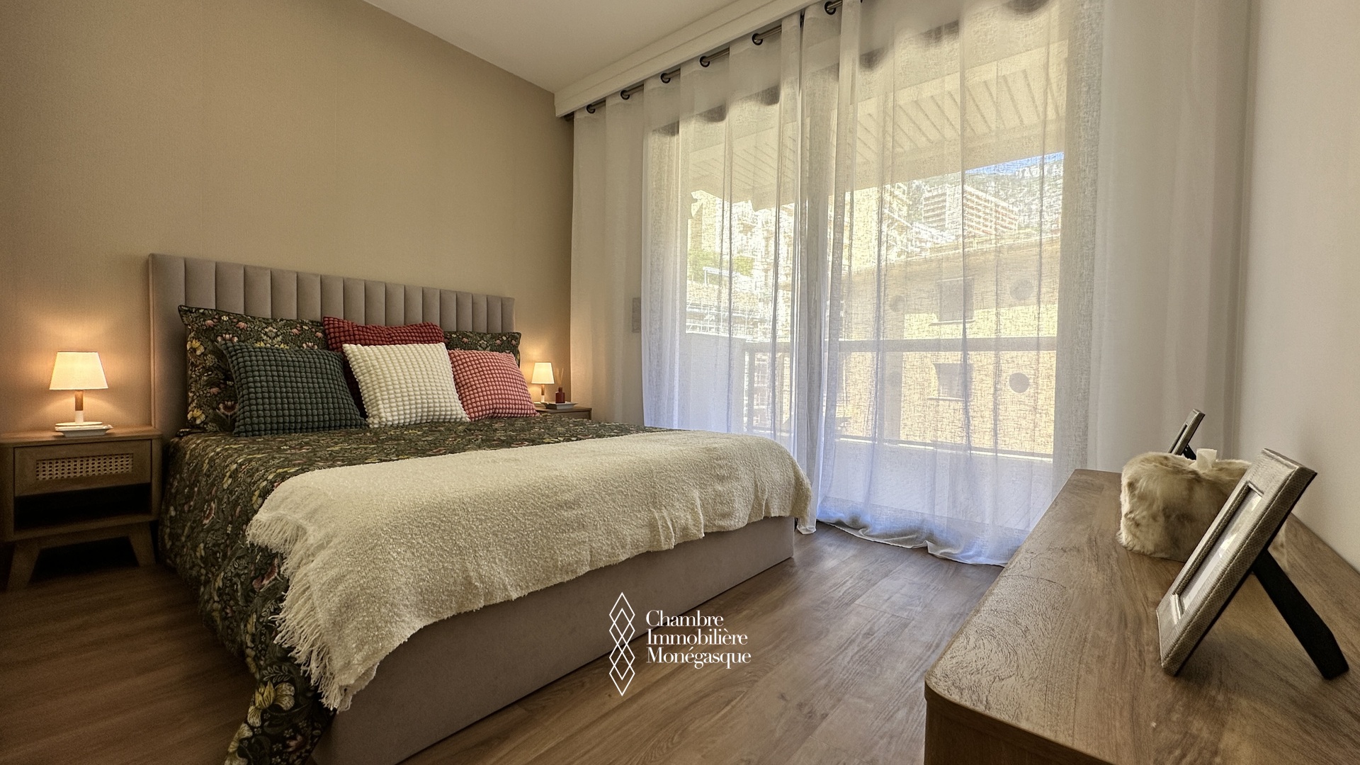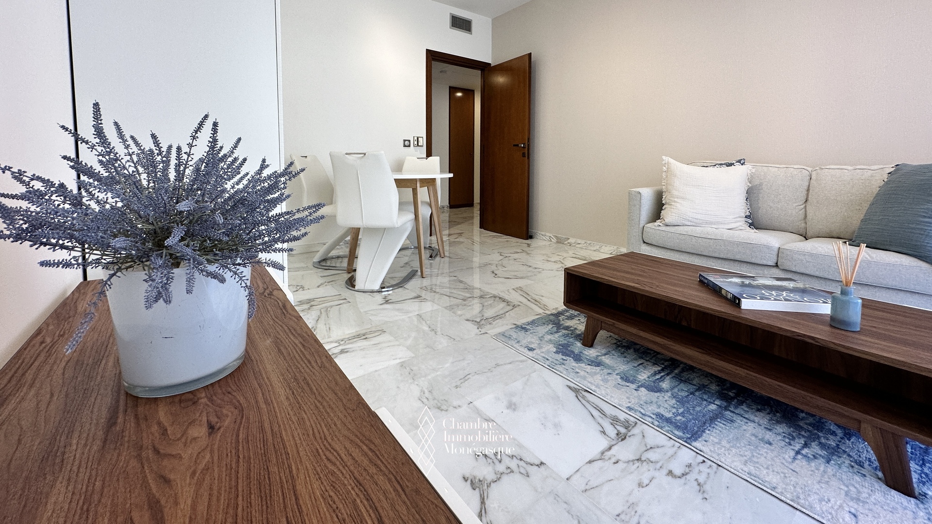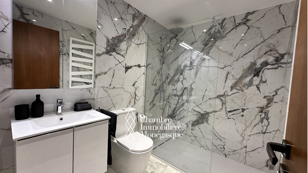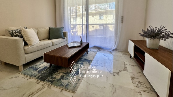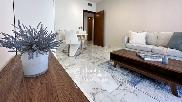 Cet appartement de 2 pièces, très fonctionnel, dispose d'une entrée avec placards, d'un salon, d'une cuisine indépendante équipée, d'un toilette invités, d'une chambre avec salle de douche avec water closet ensuite, et d'un grand balcon filant accessible depuis les deux pièces. Les finitions soignées incluent du marbre au sol, du parquet sur le balcon et des portes en bois. De nombreux rangements sont intégrés. Rénové et meublé, prêt à vivre. Ce bien comprend également une cave numéro 251 au deuxième sous-sol et un parking numéro 114 au premier sous-sol. Ne manquez pas cette opportunité unique au cœur de Monaco.