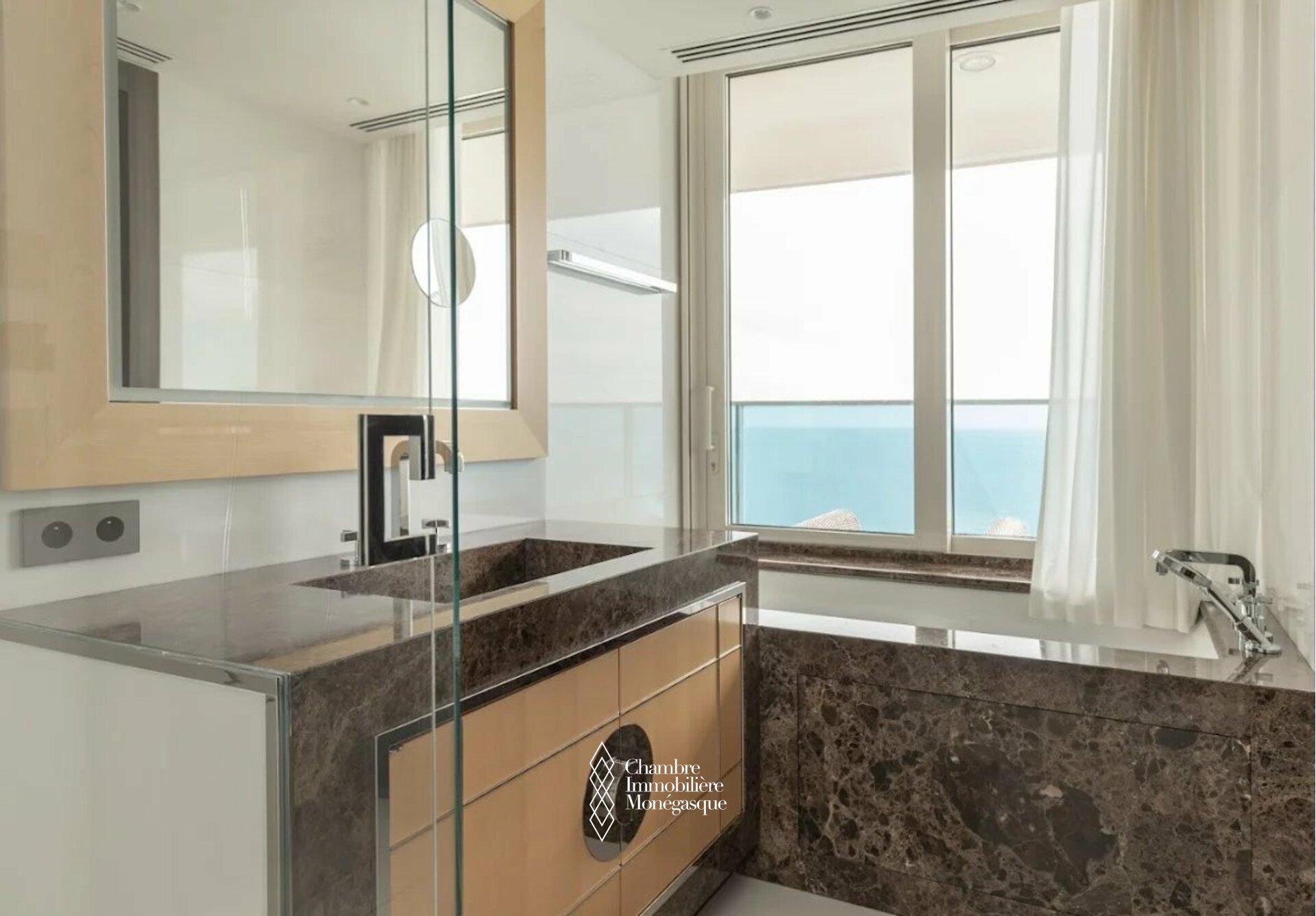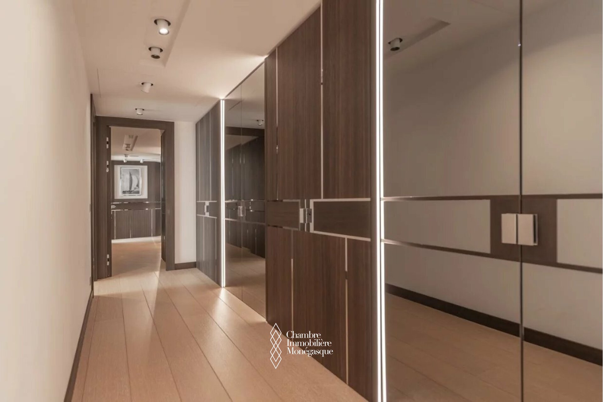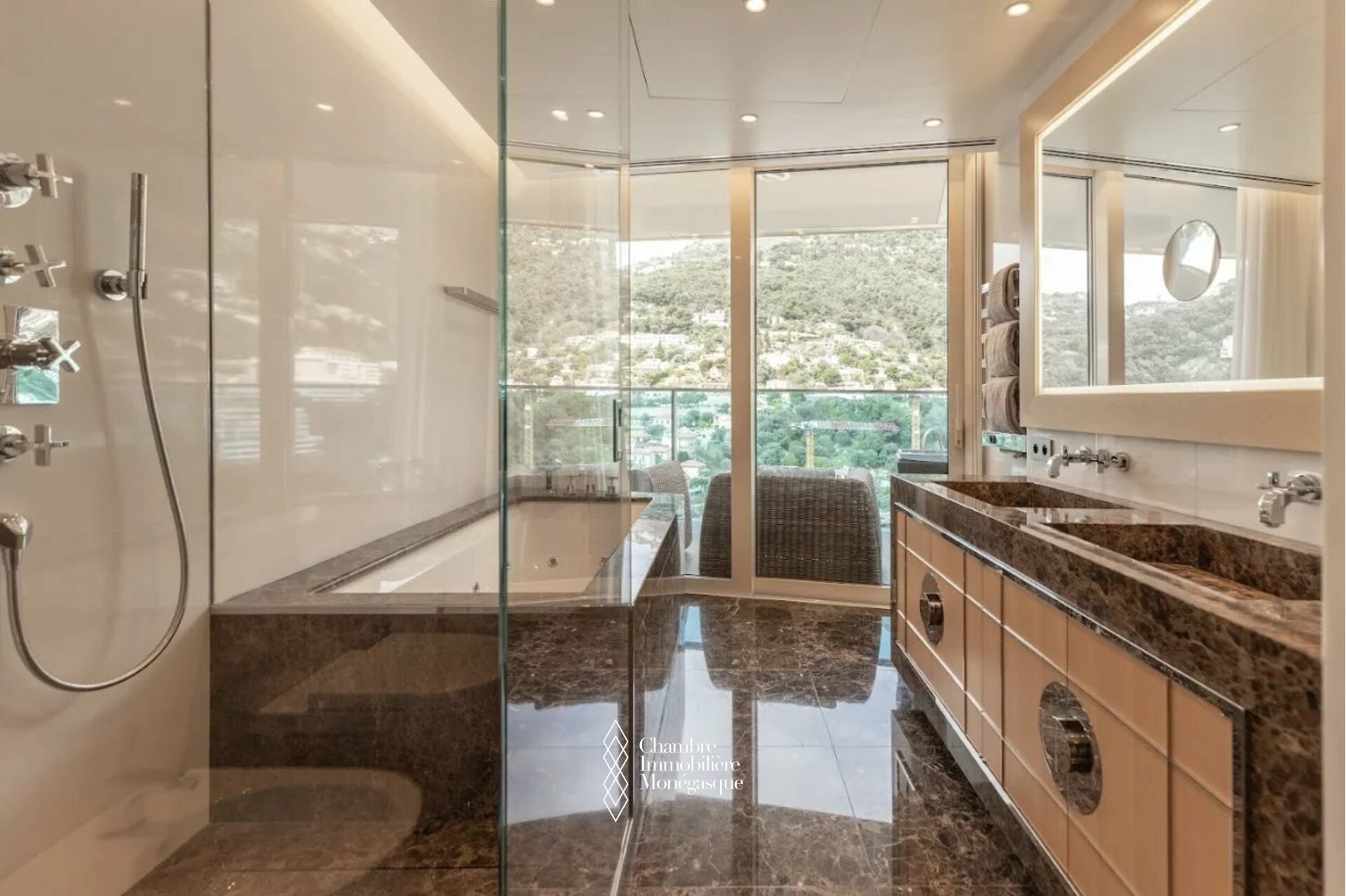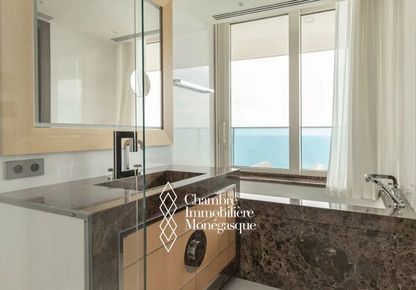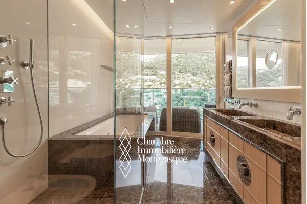 L'appartement comprend un majestueux hall d'entrée ouvrant sur un double séjour lumineux, une cuisine moderne entièrement équipée, quatre chambres spacieuses, chacune avec sa propre salle de bains et son dressing. Deux magnifiques et larges terrasses offrent des vues spectaculaires sur la Méditerranée, les côtes monégasques, françaises et italiennes.