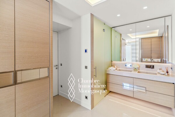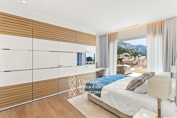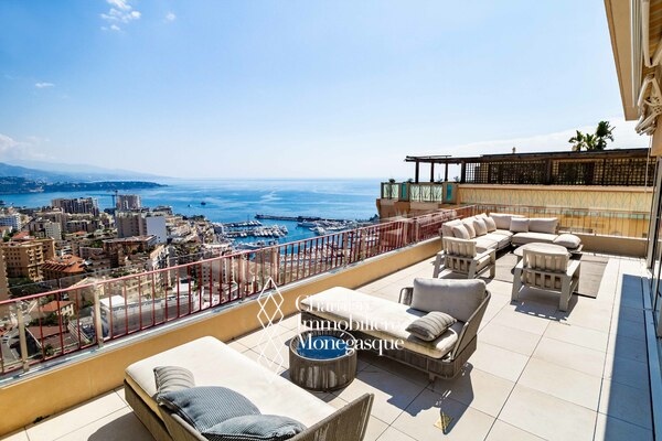Dans les hauteurs de la Principauté et situé dans un quartier apprécié pour sa tranquillité et facilité d'accès, cet appartement de 5 pièces a été entièrement rénové et meublé avec des matériaux de très grande qualité. Ce penthouse est composé d'un double salon et d'une cuisine entièrement équipée, de 4 spacieuses chambres en suite chacune avec son propre dressing, salle de bains et toilettes séparés. Escalier intérieur menant au niveau supérieur avec une cuisine d'été, un espace séjour et salle à manger, une cave à vin, un toilettes invité et une piscine privée. Trois box dont un pour deux voitures complètent ce bien immobilier d'exception.