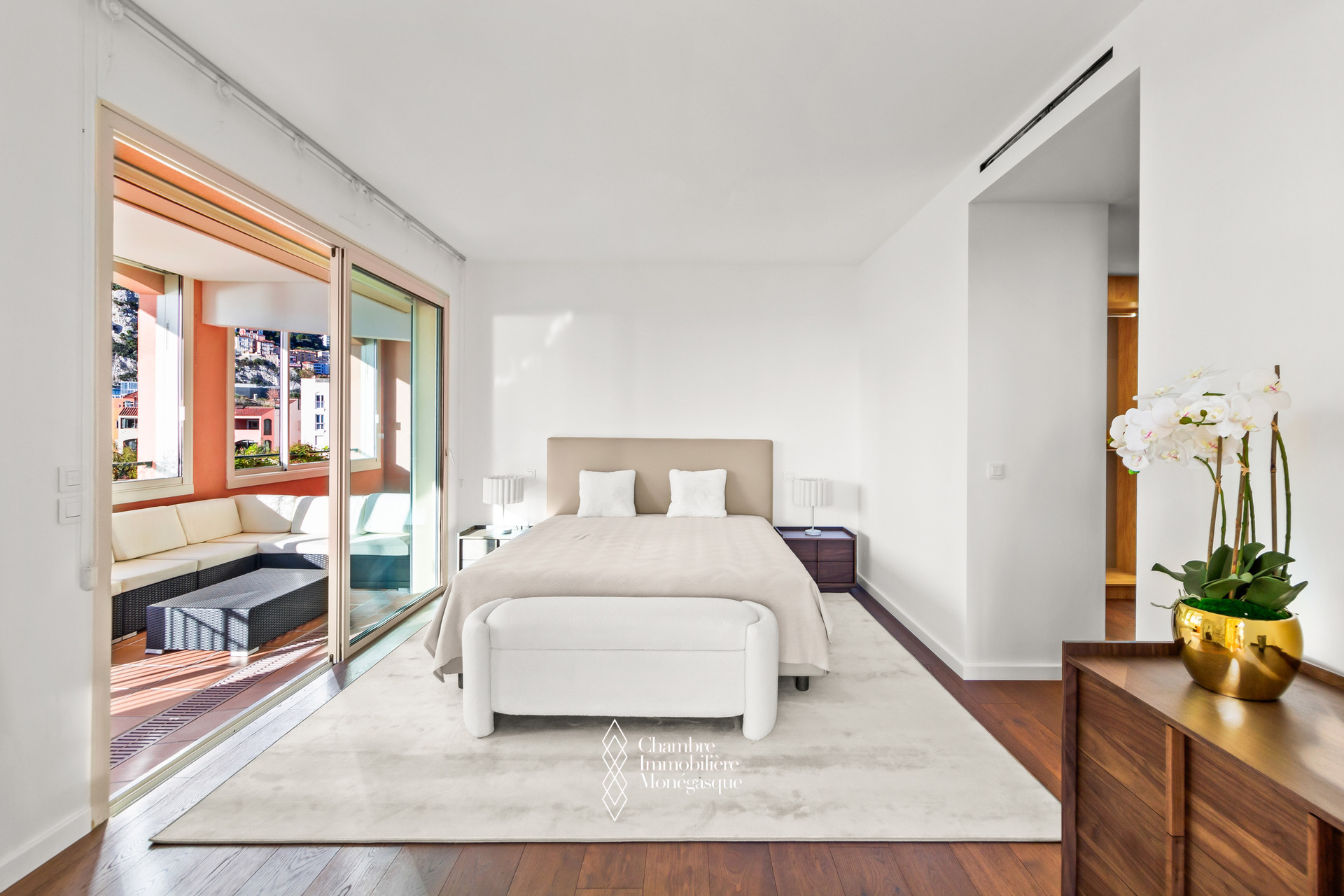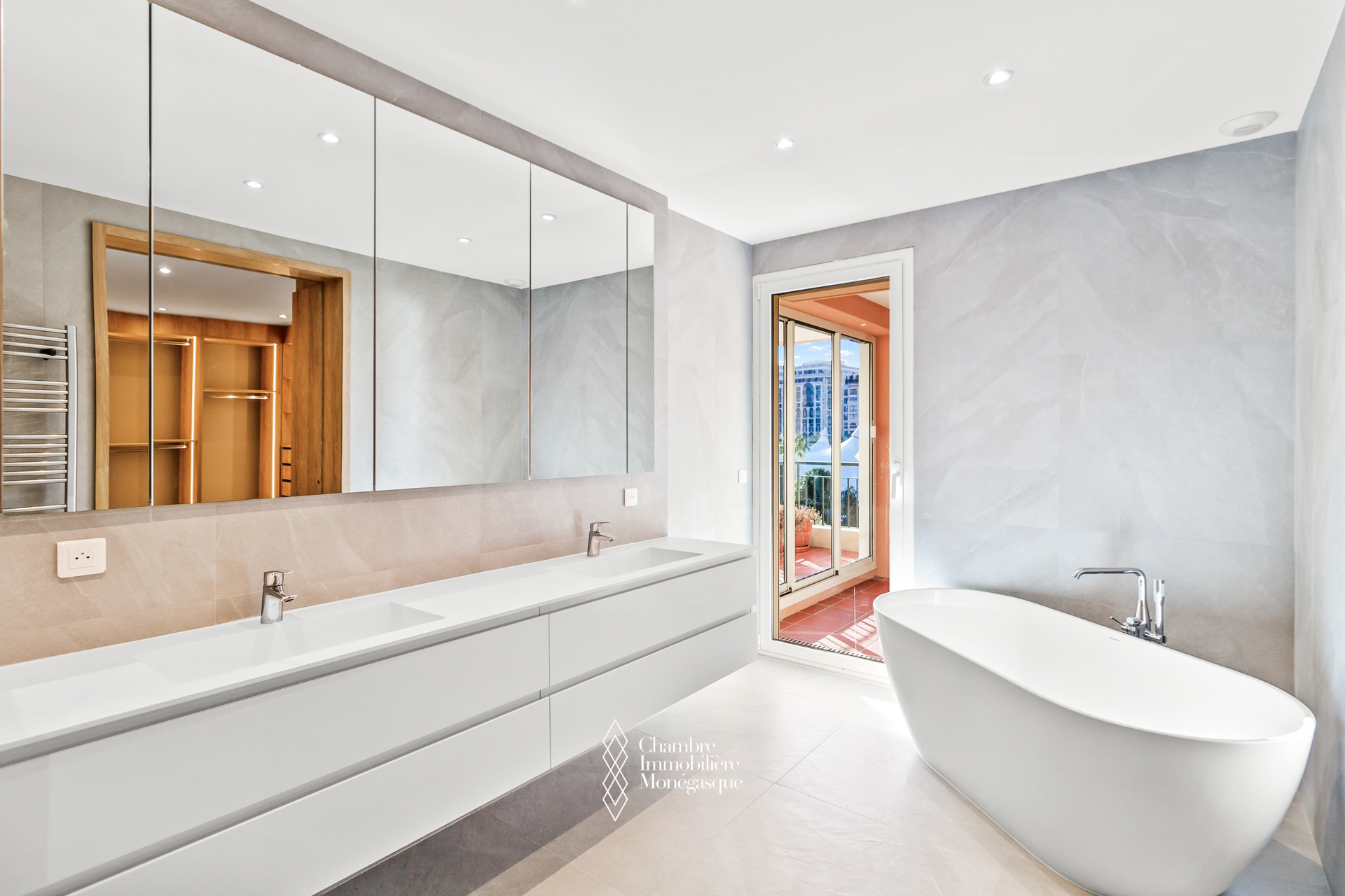 Le balcon principal, profond et aménageable, permet de recevoir ou de se détendre en toute intimité, sans aucun vis-à-vis, tout en profitant de vues imprenables sur la Méditerranée et les jardins en contrebas.