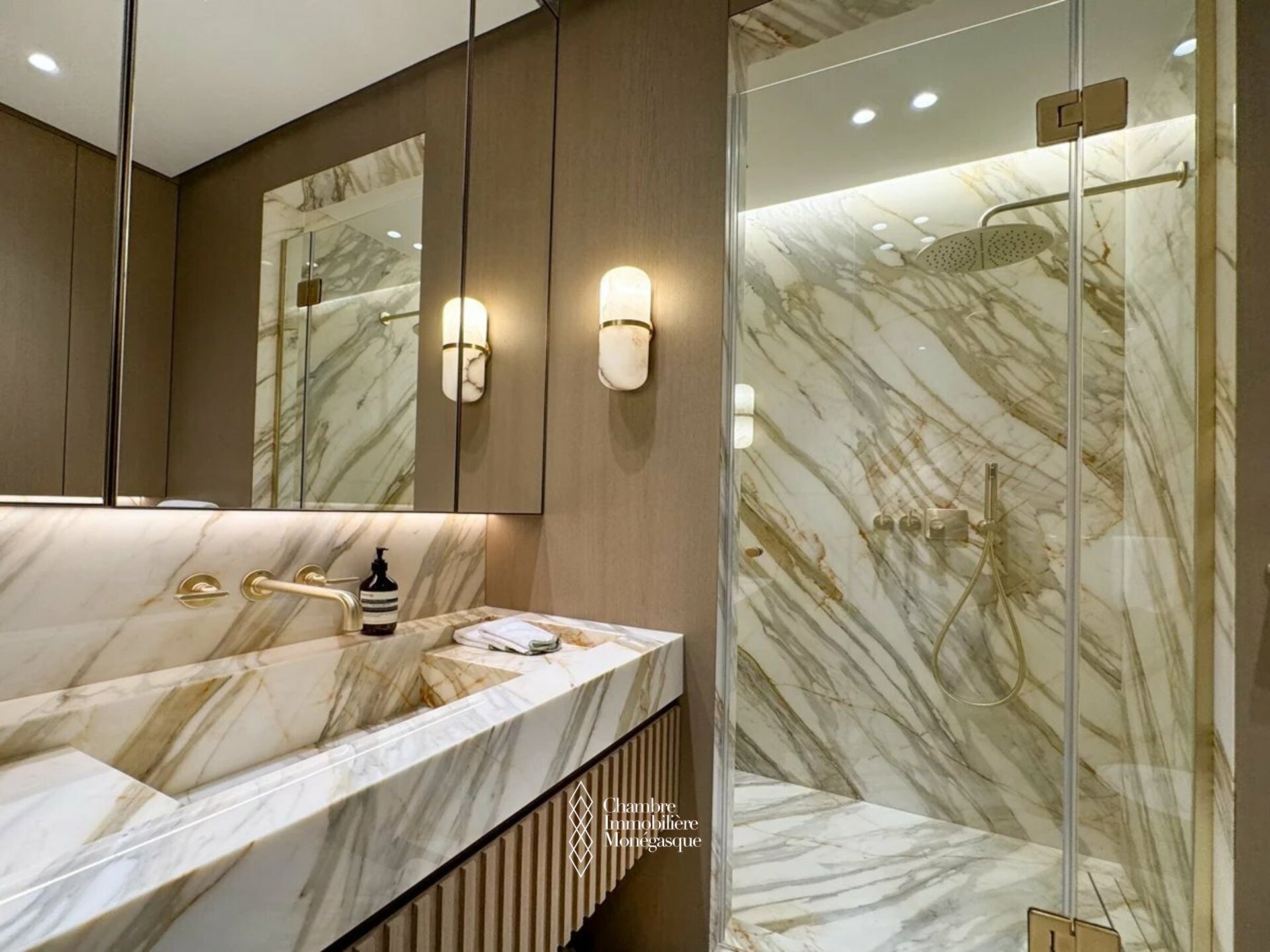 L’appartement se compose d’une vaste entrée ouvrant sur un double séjour avec cuisine ouverte entièrement équipée, d’une chambre de maître avec salle de bains en suite, d’un dressing et d’un bureau, de deux autres chambres en suite avec salles d’eau, d’un WC invités, ainsi que d’une profonde terrasse offrant une vue spectaculaire sur le port de Cap-d’Ail.
