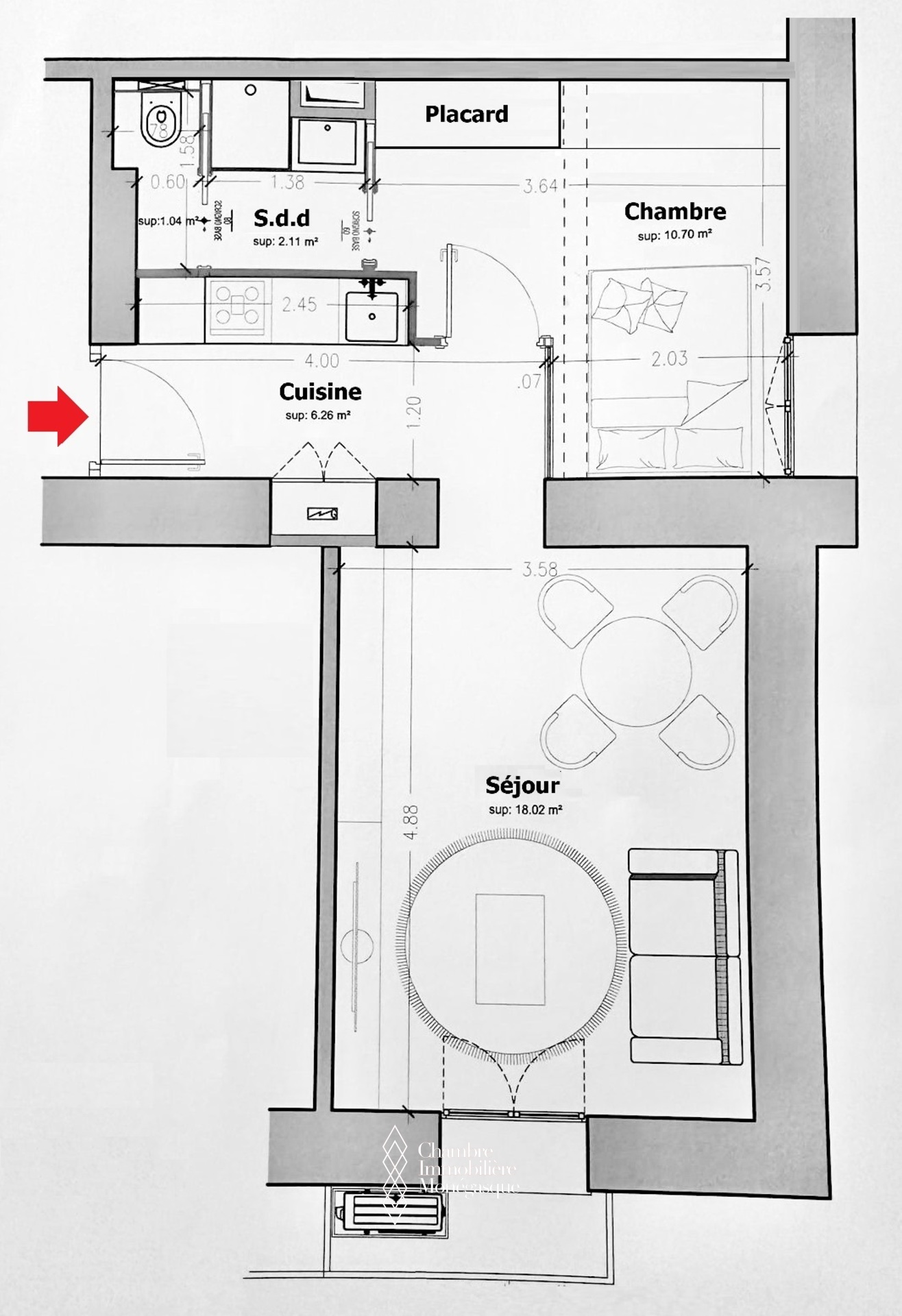 Entrée, kitchenette équipée, séjour, chambre avec rangement, salle douche complète, climatisation
