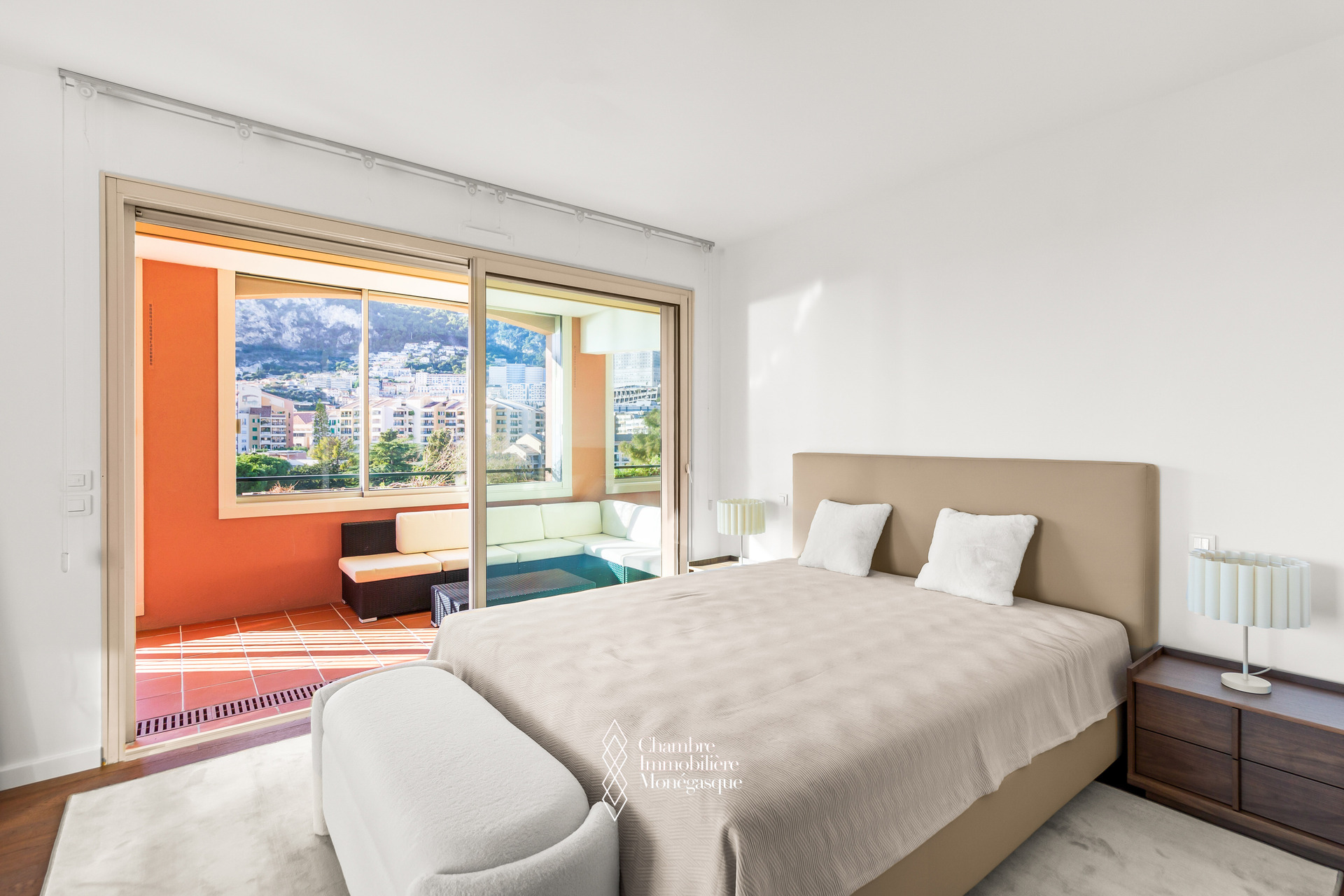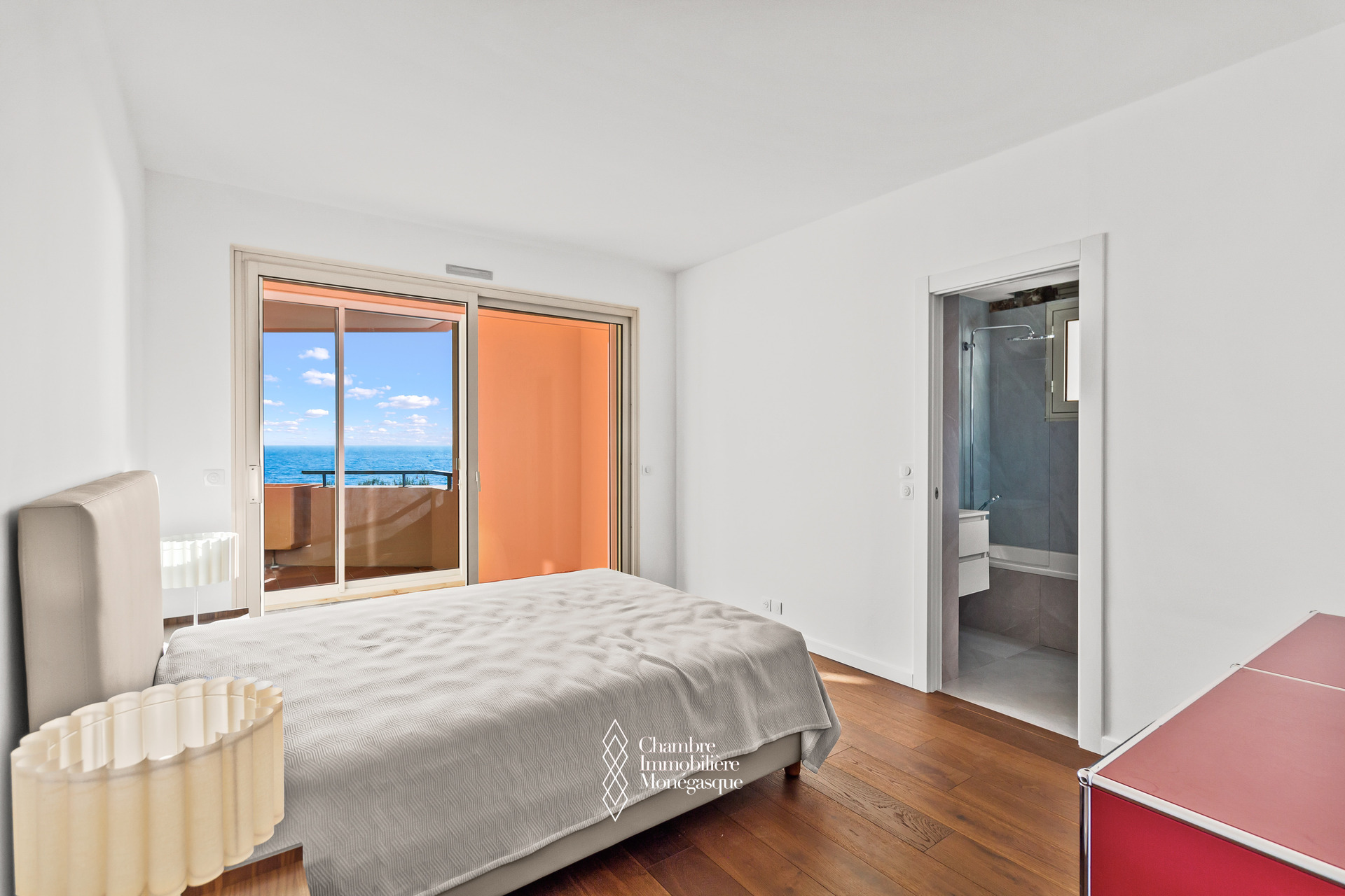 Le balcon principal, profond et aménageable, permet de recevoir ou de se détendre en toute intimité, sans aucun vis-à-vis, tout en profitant de vues imprenables sur la Méditerranée et les jardins en contrebas.