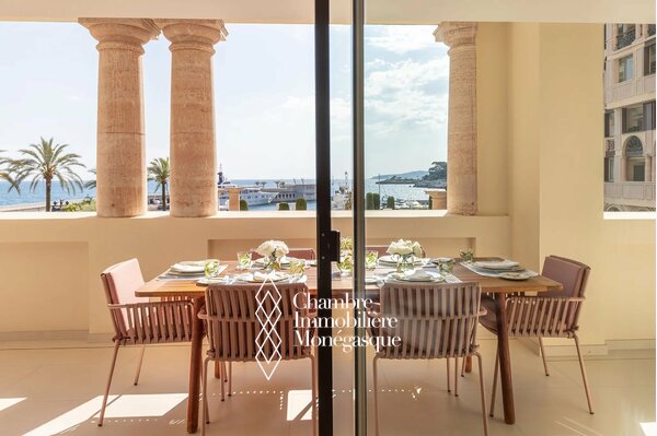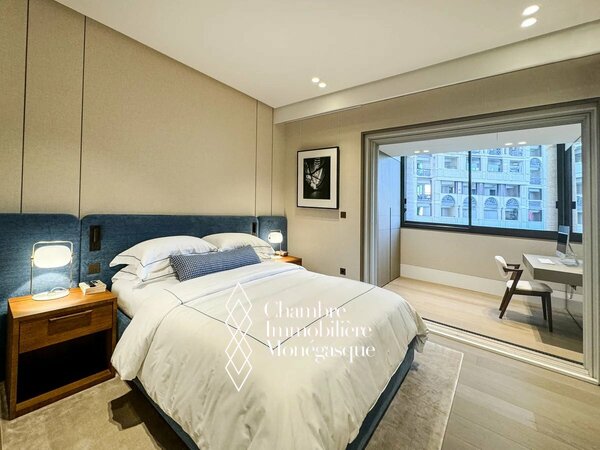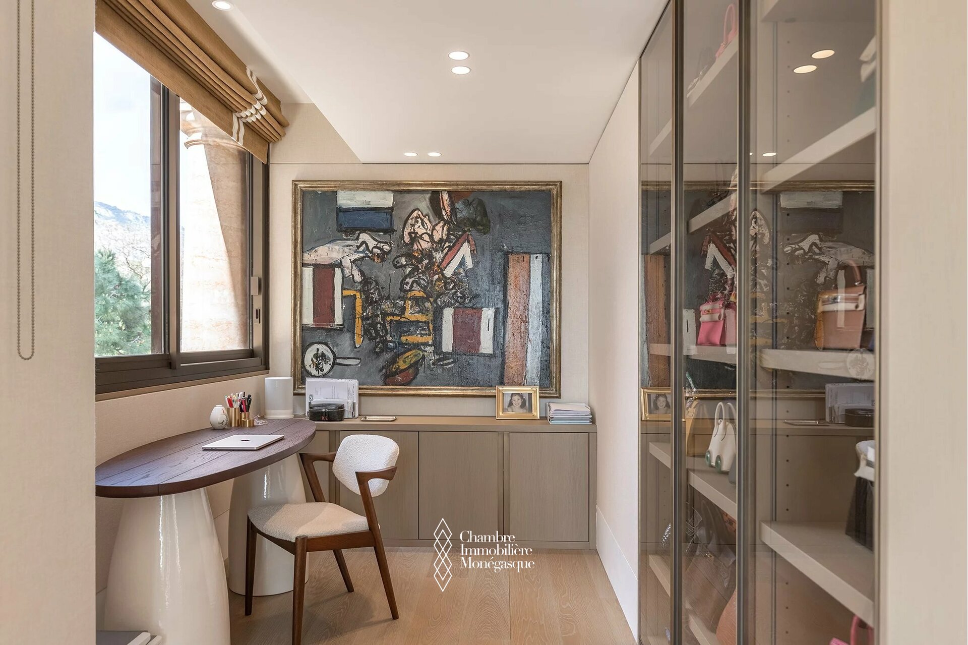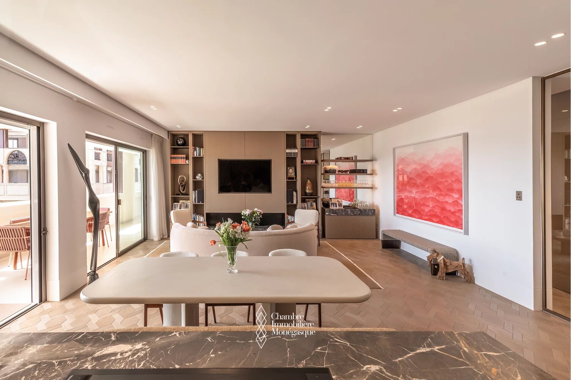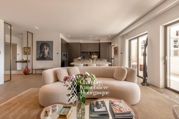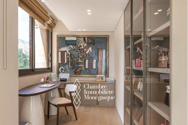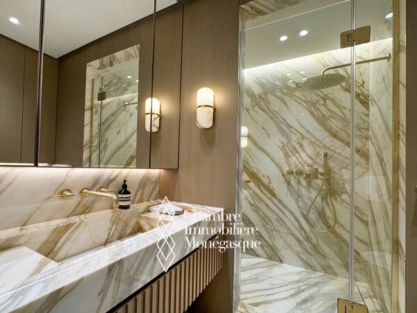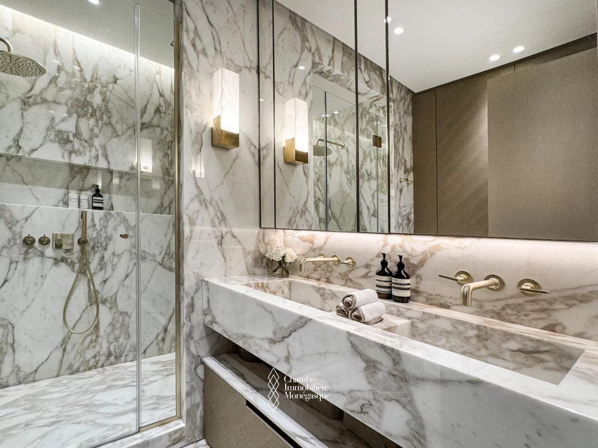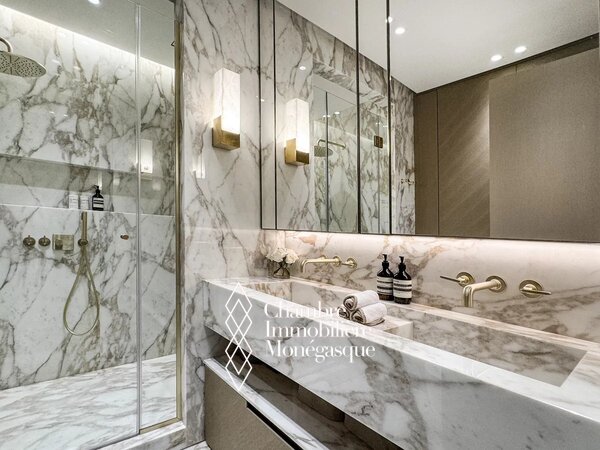 L’appartement se compose d’une vaste entrée ouvrant sur un double séjour avec cuisine ouverte entièrement équipée, d’une chambre de maître avec salle de bains en suite, d’un dressing et d’un bureau, de deux autres chambres en suite avec salles d’eau, d’un WC invités, ainsi que d’une profonde terrasse offrant une vue spectaculaire sur le port de Cap-d’Ail.