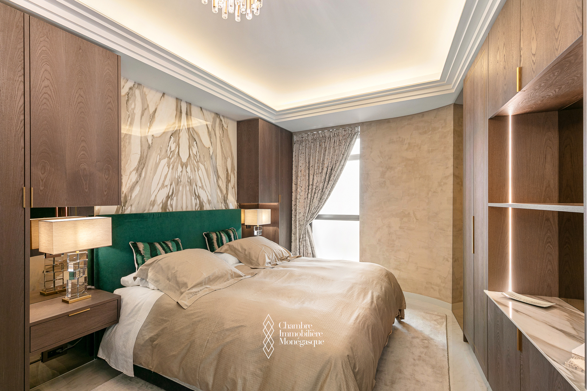 Un meuble TV mural avec placards, complète l'ensemble, tandis que des corniches rétroéclairées et un lustre central viennent sublimer l'ambiance de l'appartement.