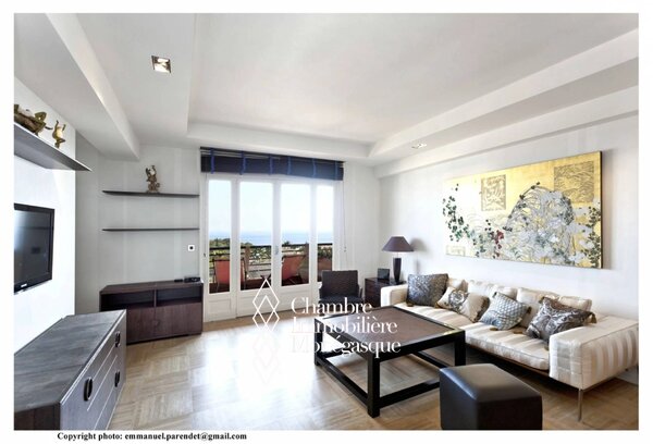 Cet appartement est composé d'un hall d'entrée donnant sur un bel espace de vie lumineux, avec une cuisine équipée et ouverte sur le salon, une belle chambre de maître avec sa salle de bain, donnant  du côté mer, une 2ème chambre.