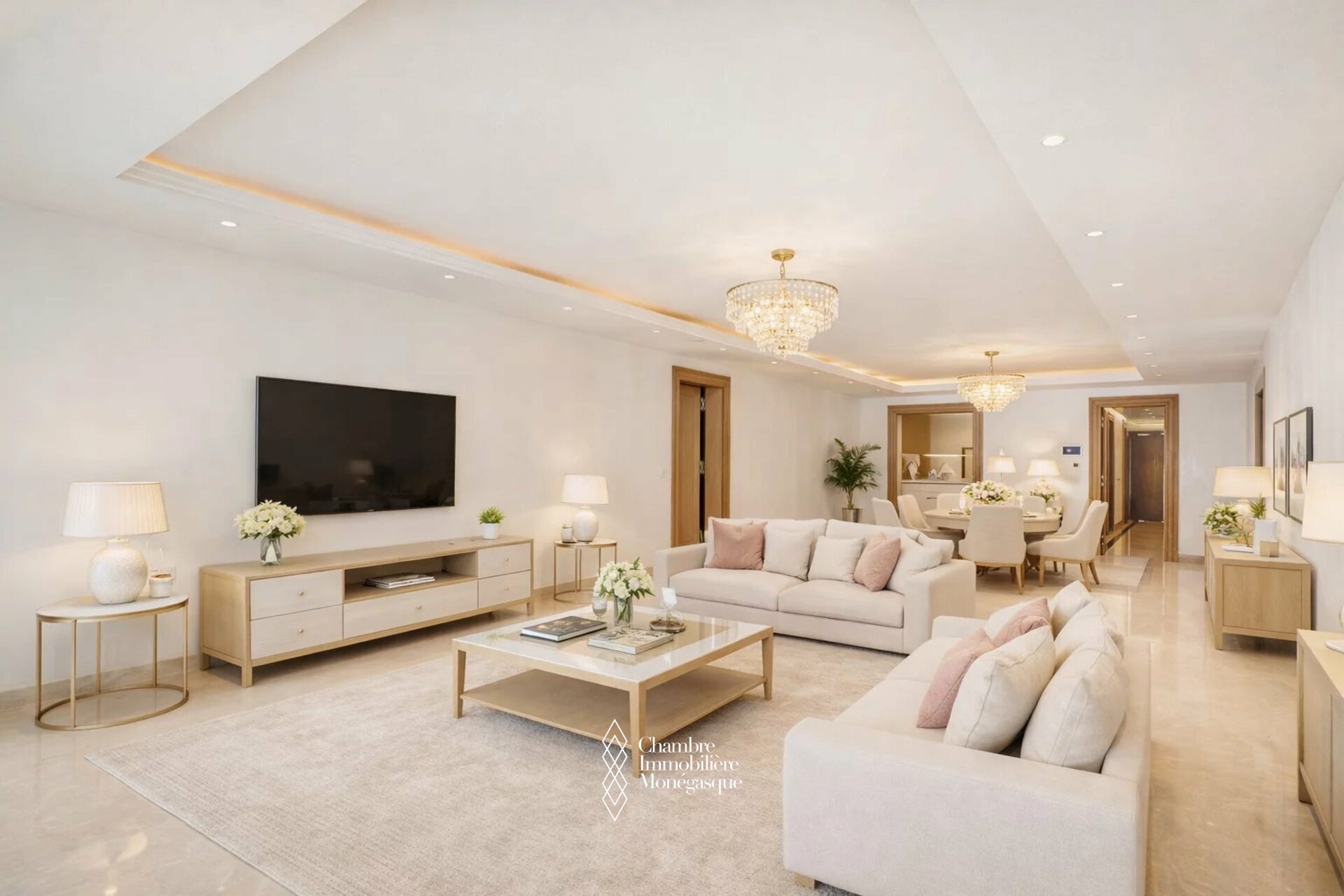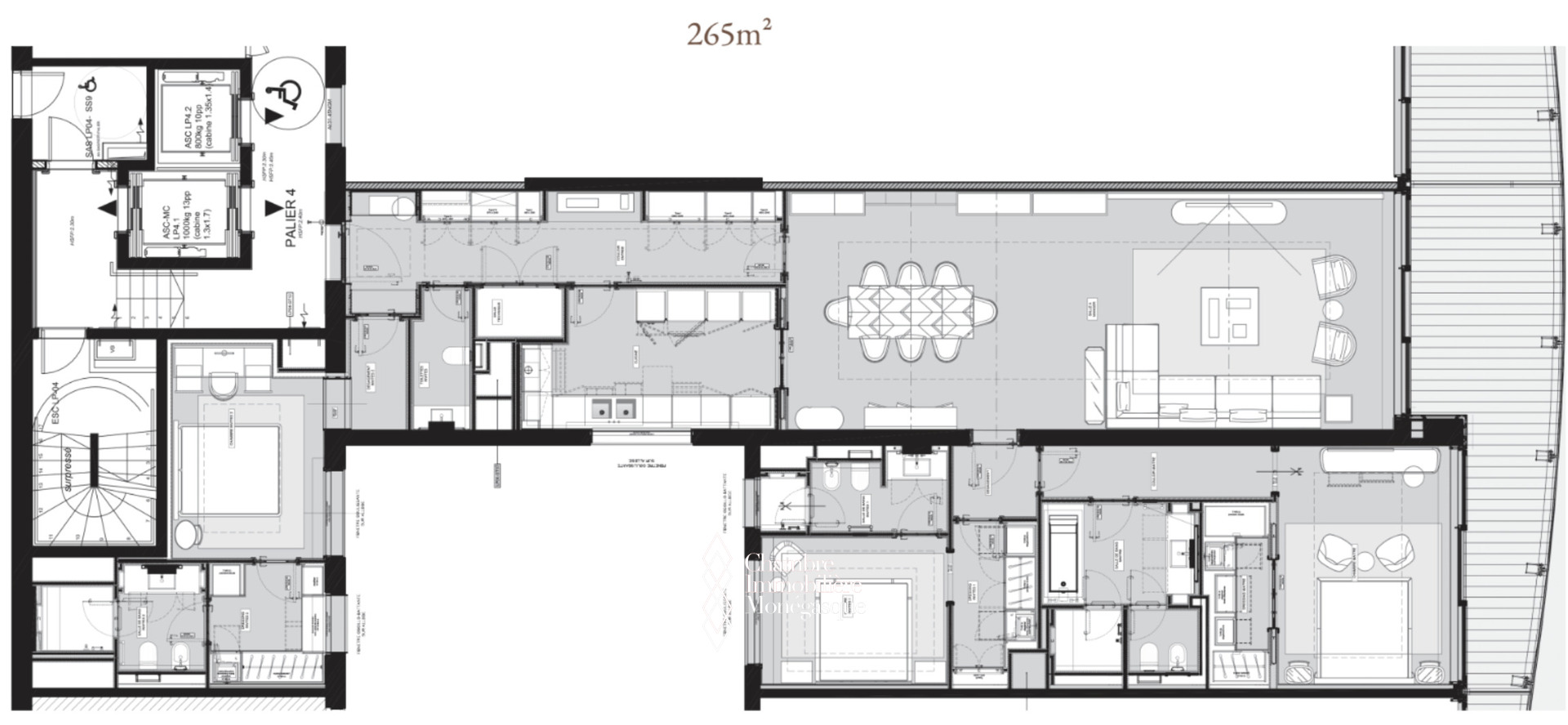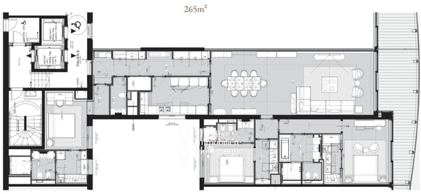 L’appartement se compose d’une entrée, d’un double séjour, d’une belle cuisine entièrement équipée, de trois spacieuses chambres, chacune avec sa propre salle de bain, ainsi que de deux dressings.