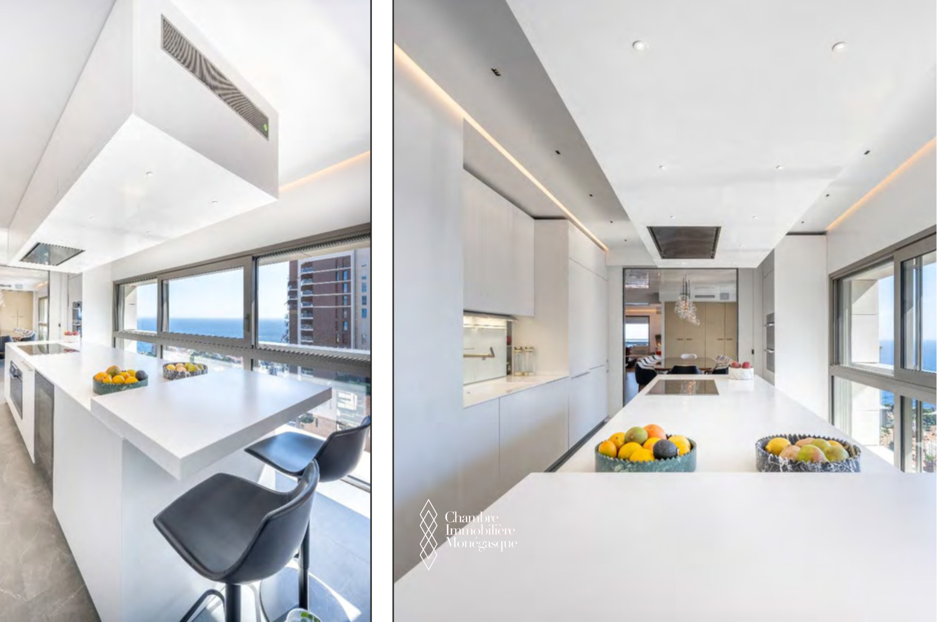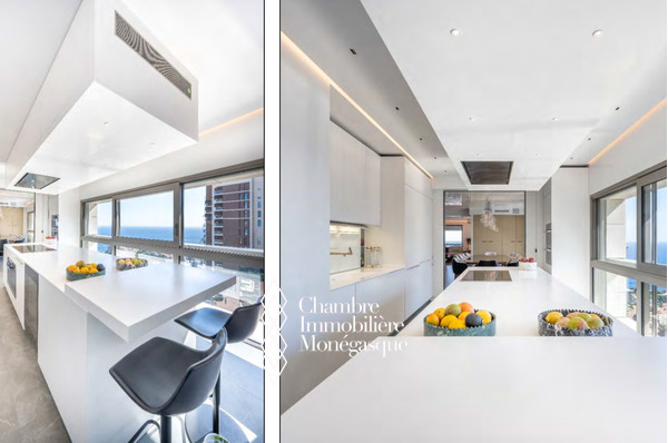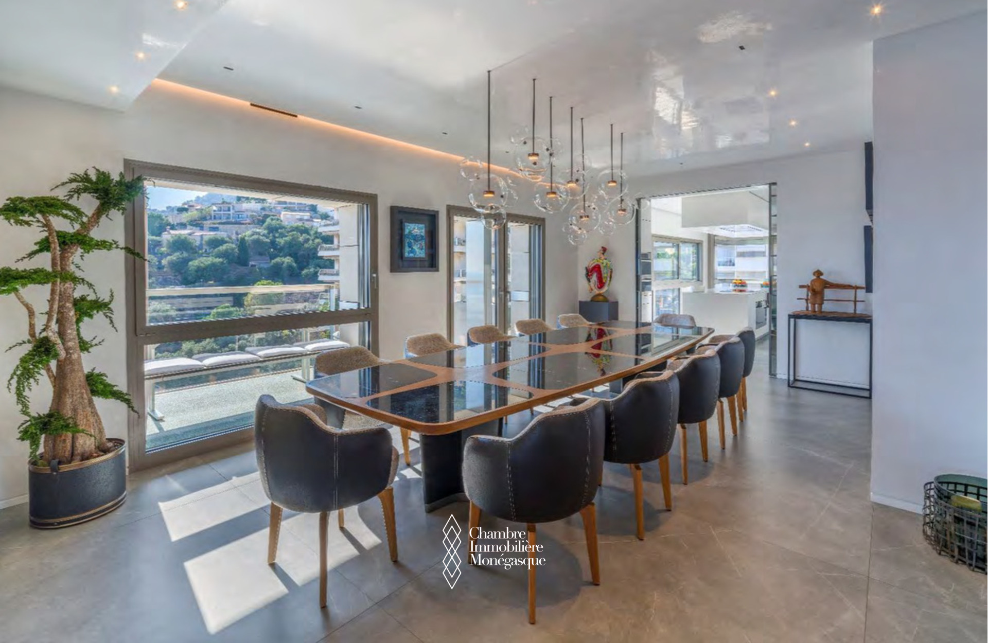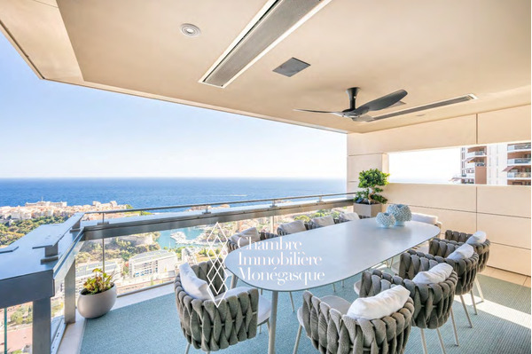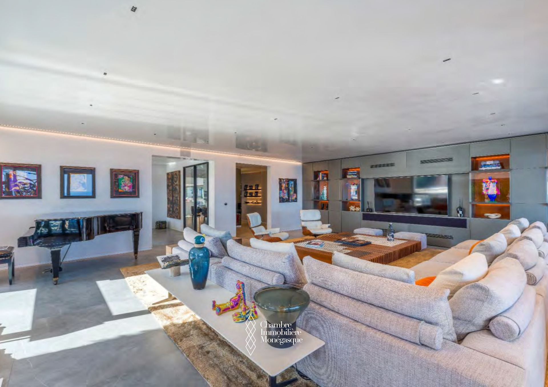 L'appartement dispose d'un vaste espace de vie avec un salon ouvrant sur une grande terrasse, offrant une vue panoramique à couper le souffle sur la Principauté, le Palais Princier et l'immensité bleue de la mer Méditerranée.