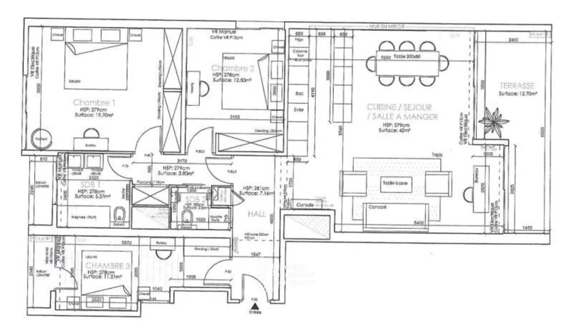 Il est composé d'une entrée donnant sur le spacieux séjour, une cuisine ouverte, entièrement équipée, trois chambres à coucher, une salle de bain avec toilette et une salle de douche avec toilette.