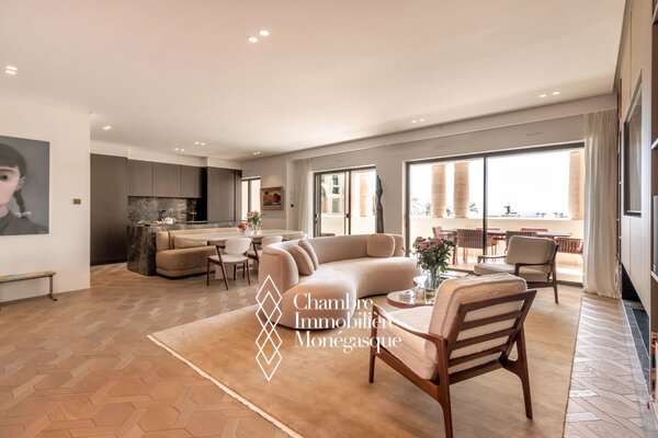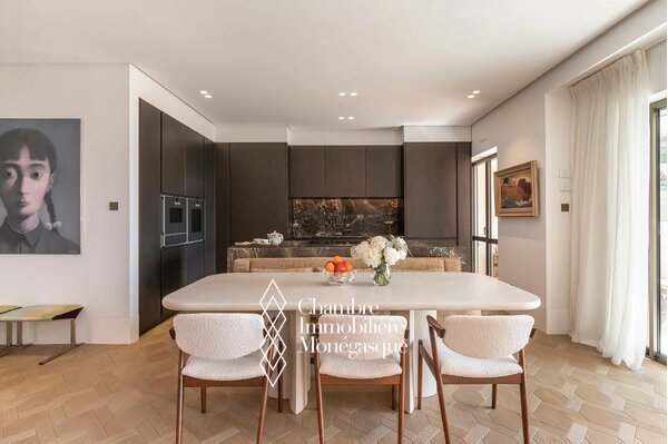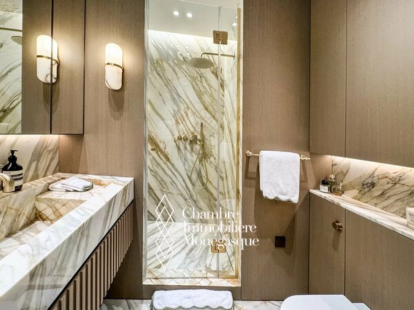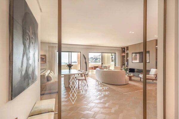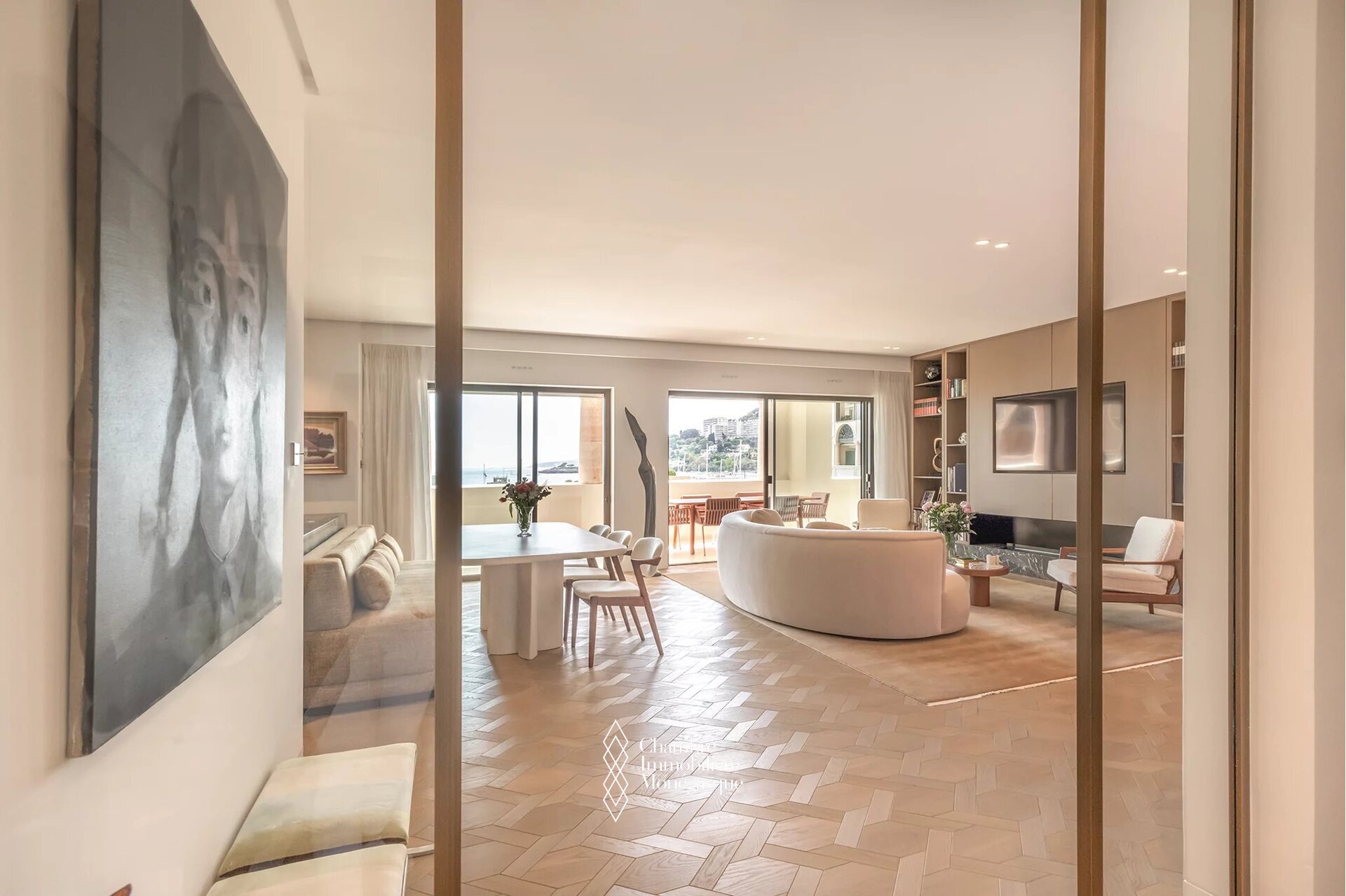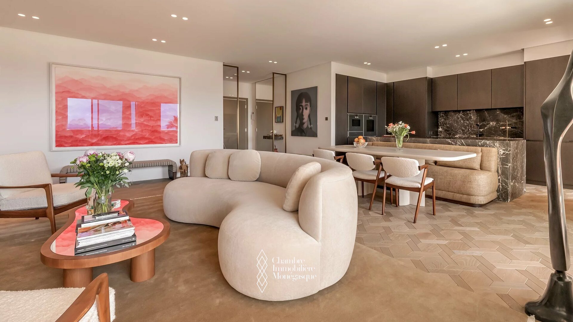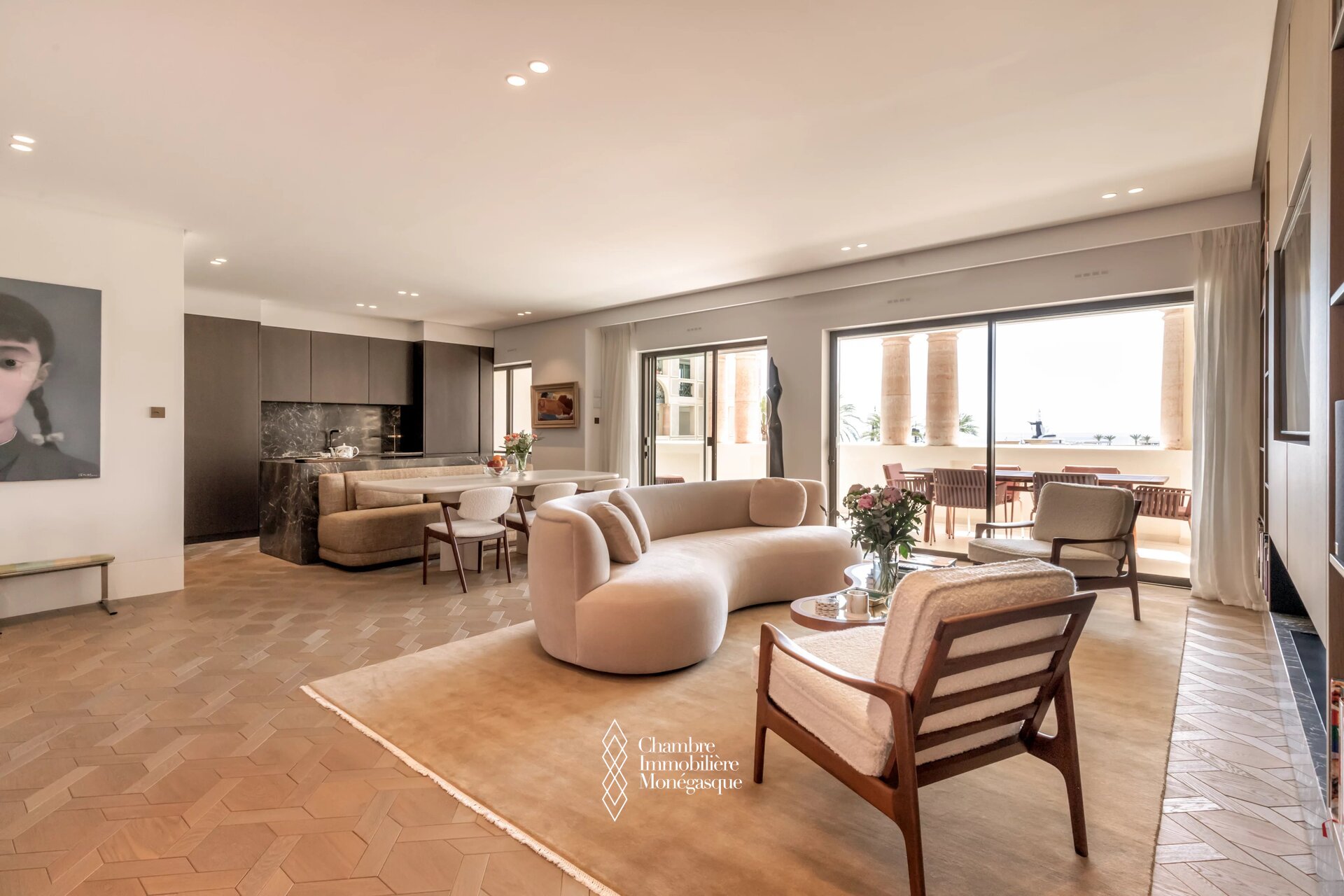 L’appartement se compose d’une vaste entrée ouvrant sur un double séjour avec cuisine ouverte entièrement équipée, d’une chambre de maître avec salle de bains en suite, d’un dressing et d’un bureau, de deux autres chambres en suite avec salles d’eau, d’un WC invités, ainsi que d’une profonde terrasse offrant une vue spectaculaire sur le port de Cap-d’Ail.