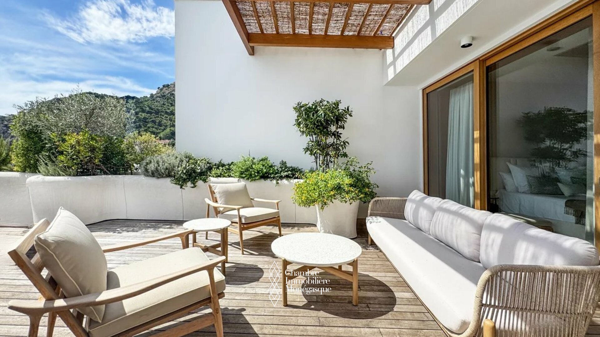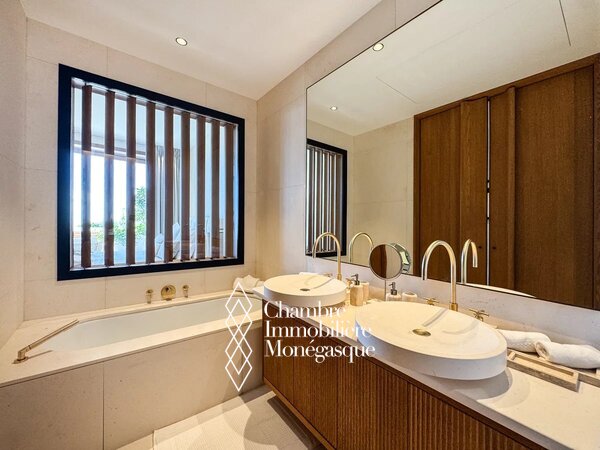 Bienvenue dans la résidence L'Exotique, dont le lobby donne déjà le ton d'un habitat luxueux. Des carreaux de pierre chauds et des revêtements en bois précieux, des luminaires élégants, des sièges confortables et des détails raffinés créent une atmosphère accueillante et offrent un premier aperçu du haut niveau et du design exquis de l'ensemble du bâtiment. Vous bénéficiez également d'un service de conciergerie 24h/24 et 7j/7, d'une salle de fitness, d'un espace spa avec piscine intérieure et hammam. Un parc privé, appartenant au bâtiment et planté de nombreux oliviers, vous offre une vue impressionnante sur la Méditerranée et la Principauté. Ce magnifique appartement baigné de lumière dispose d'un salon avec coin repas qui vous donne accès à une vaste terrasse avec une vue imprenable sur la mer. La chambre à coucher principale offre beaucoup d'espace, de lumière naturelle et de nombreux placards pour votre garde-robe, ainsi qu'une magnifique salle de bain en pierre avec baignoire, douche et double lavabo. La deuxième chambre, avec sa propre salle de bain, a également accès à la terrasse. La cuisine entièrement équipée est dotée de boiseries et est à la fois fonctionnelle et élégante. La grande terrasse avec plusieurs salons et un coin repas s'étend sur 70 mètres carrés et offre une vue panoramique sur Monaco et le port de Cap d'Ail.