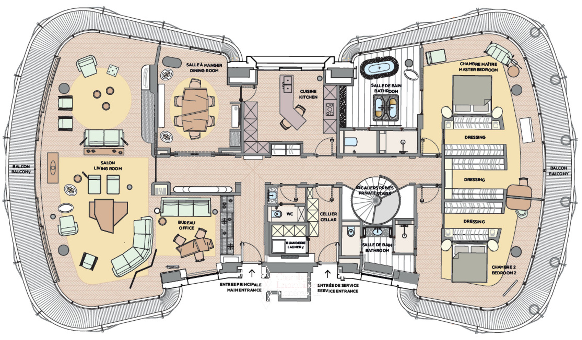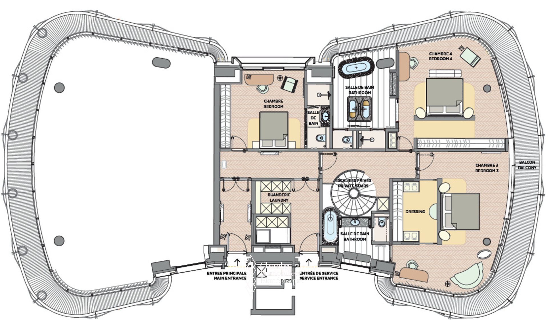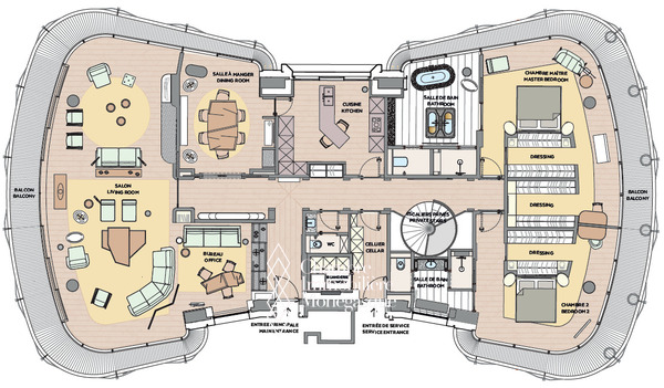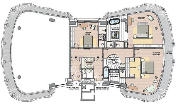 Chaque niveau est pourvu d'une entrée principale et d'une entrée de service permettant une aisance d'accès et une fluidité de circulation au sein de l'appartement entre le personnel et ses occupants.