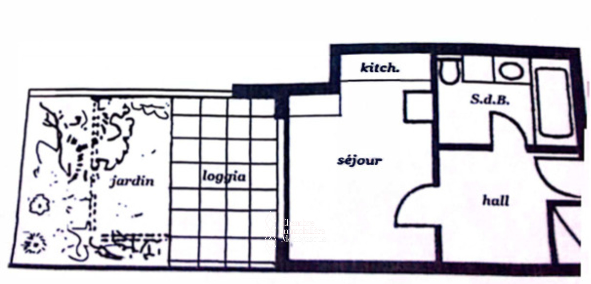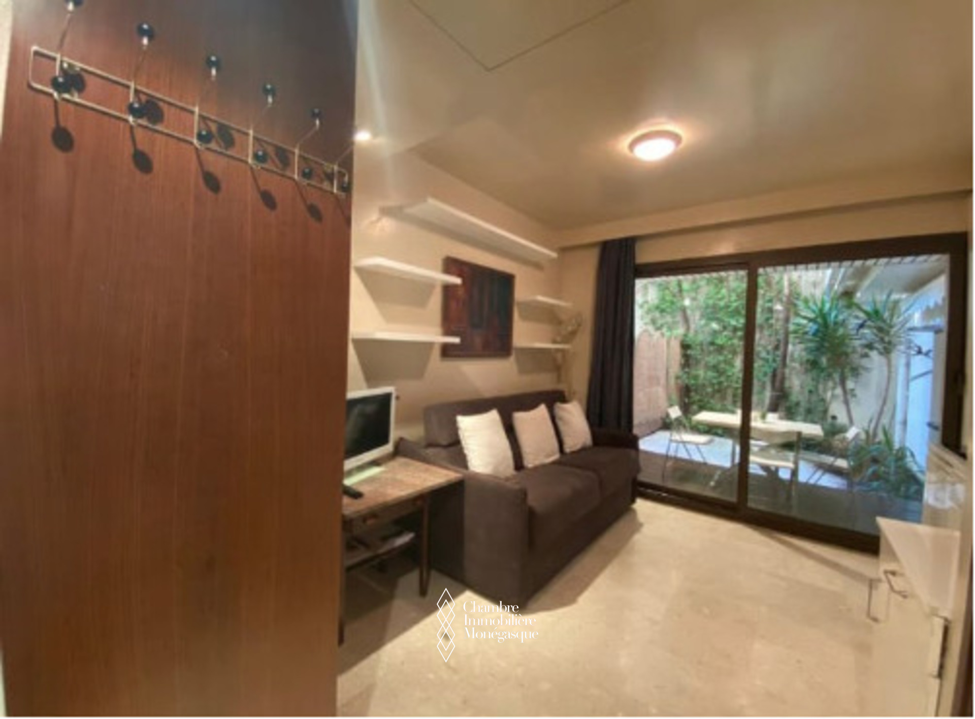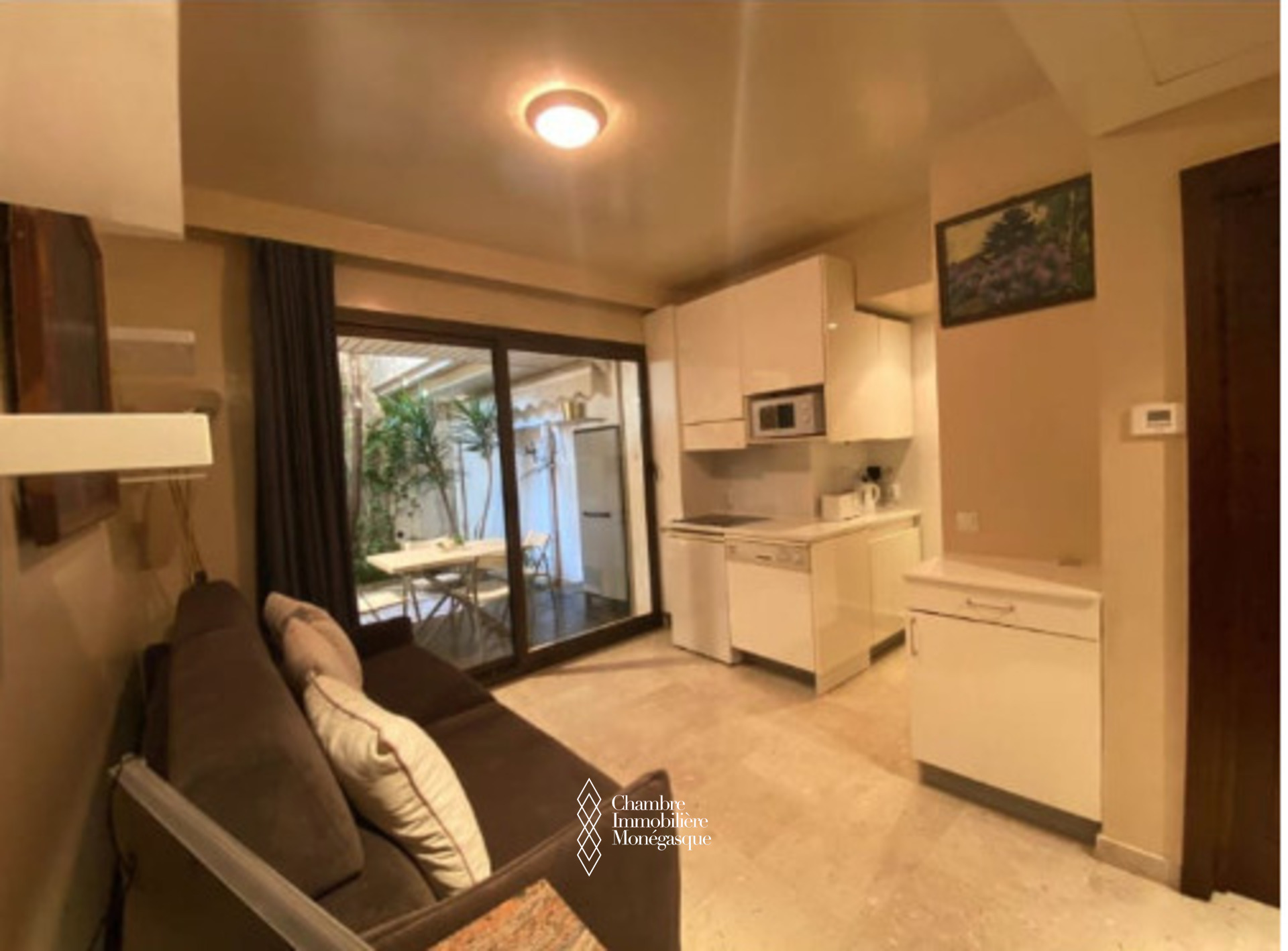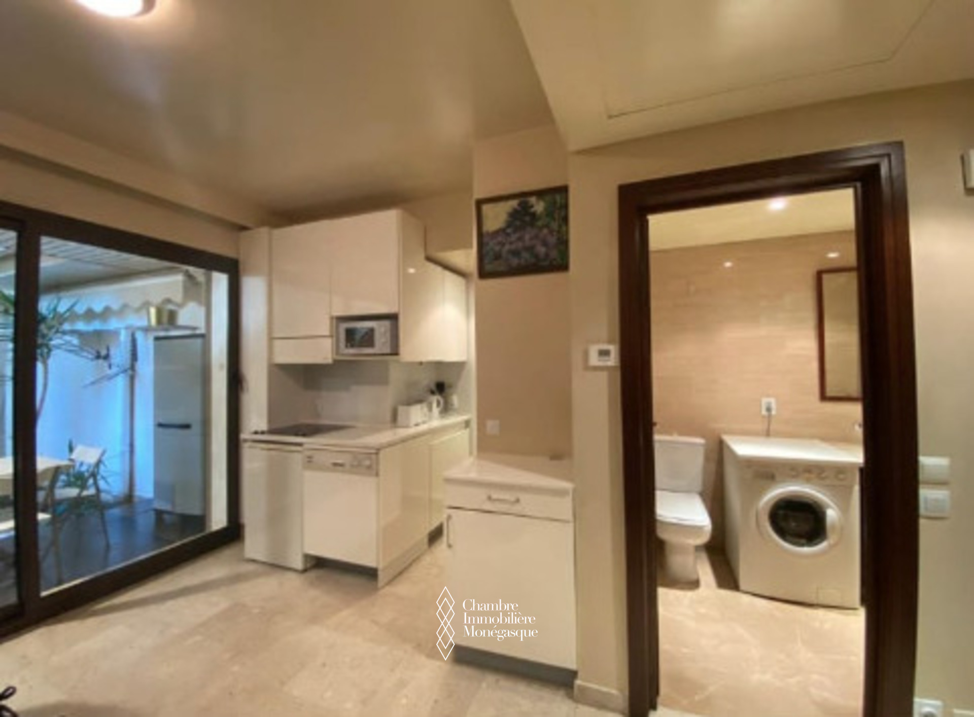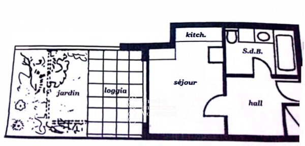 L’appartement se compose d’une pièce principale, d’une cuisine équipée, d’une grande salle de bains en marbre avec baignoire et douche et une belle terrasse de 17m2 avec jardin.`
