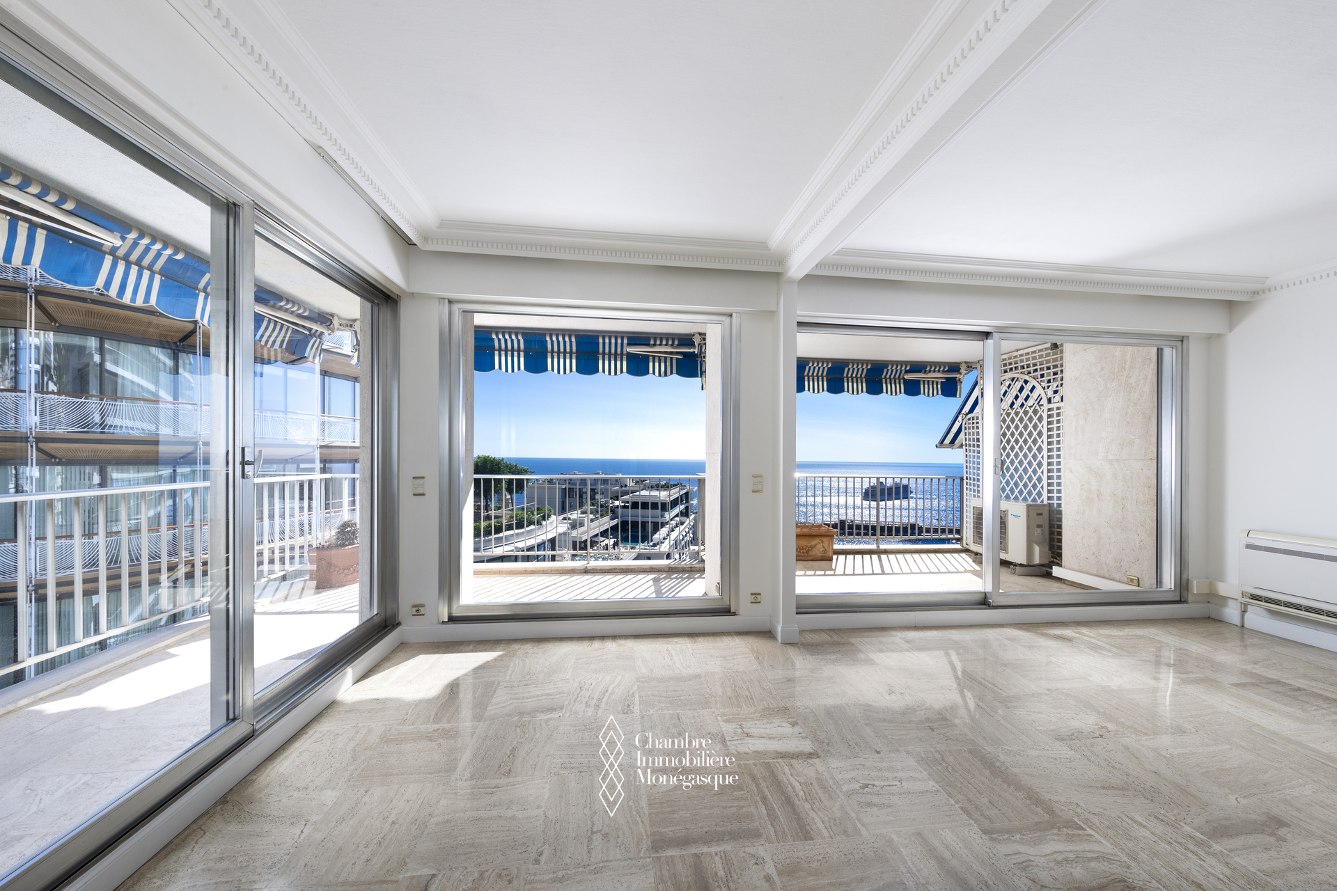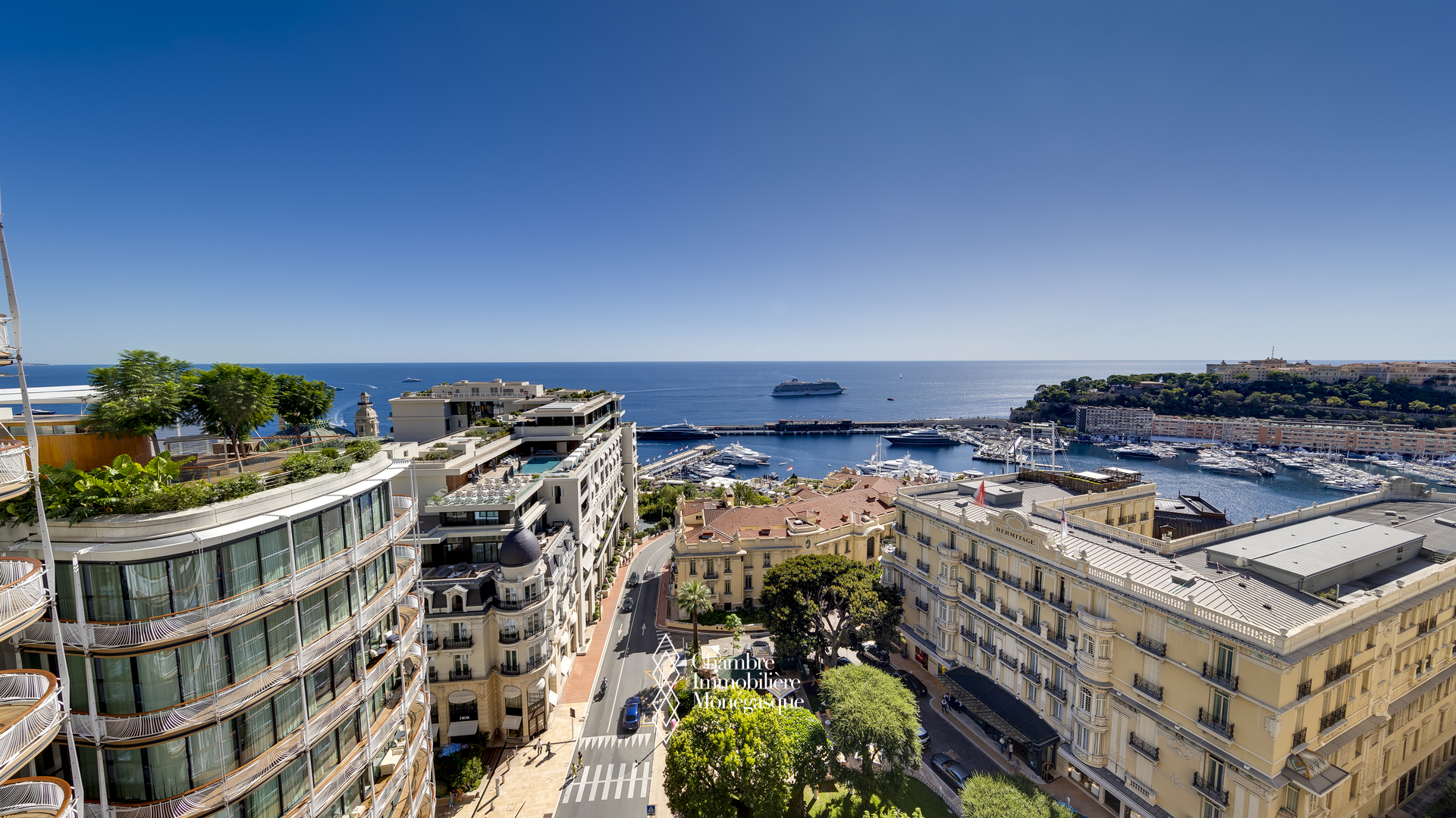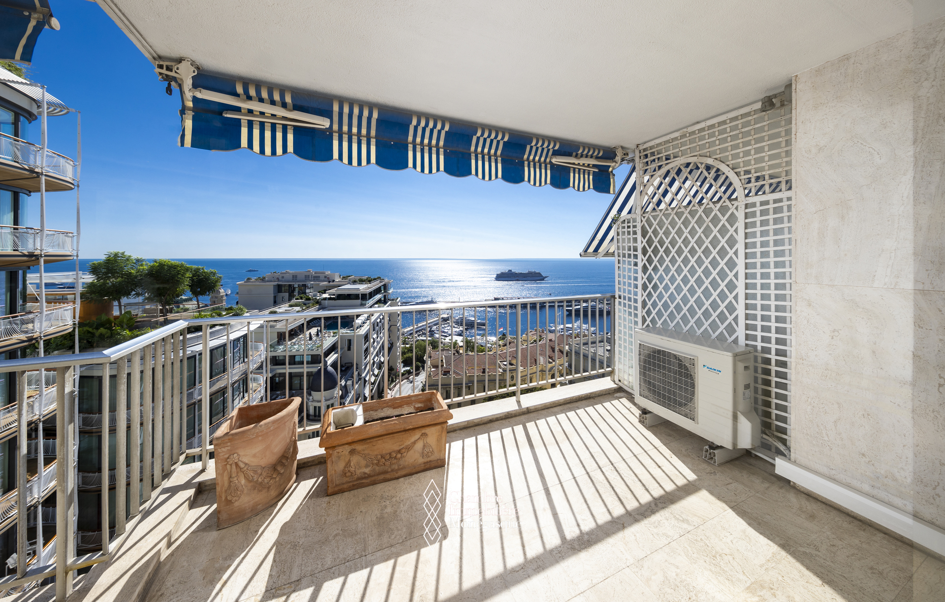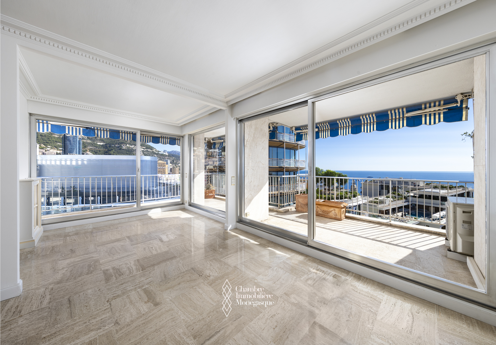 Carré d'Or - Le Sun Tower - 2 pièces Dans un immeuble de standing du Carré d'Or, Bel appartement de 2 pièces situé au 11ème étage. Vue panoramique sur la mer, le port et le rocher de Monaco. Surface totale de 108m². L'appartement se compose de : - Un hall d'entrée, - Un séjour/salle à manger ouvrant sur terrasse, Une chambre avec salle de bain complète, dressing, - Une cuisine équipée, Terrasse Circulaire.  Climatisation. Exposition Sud Ouest.