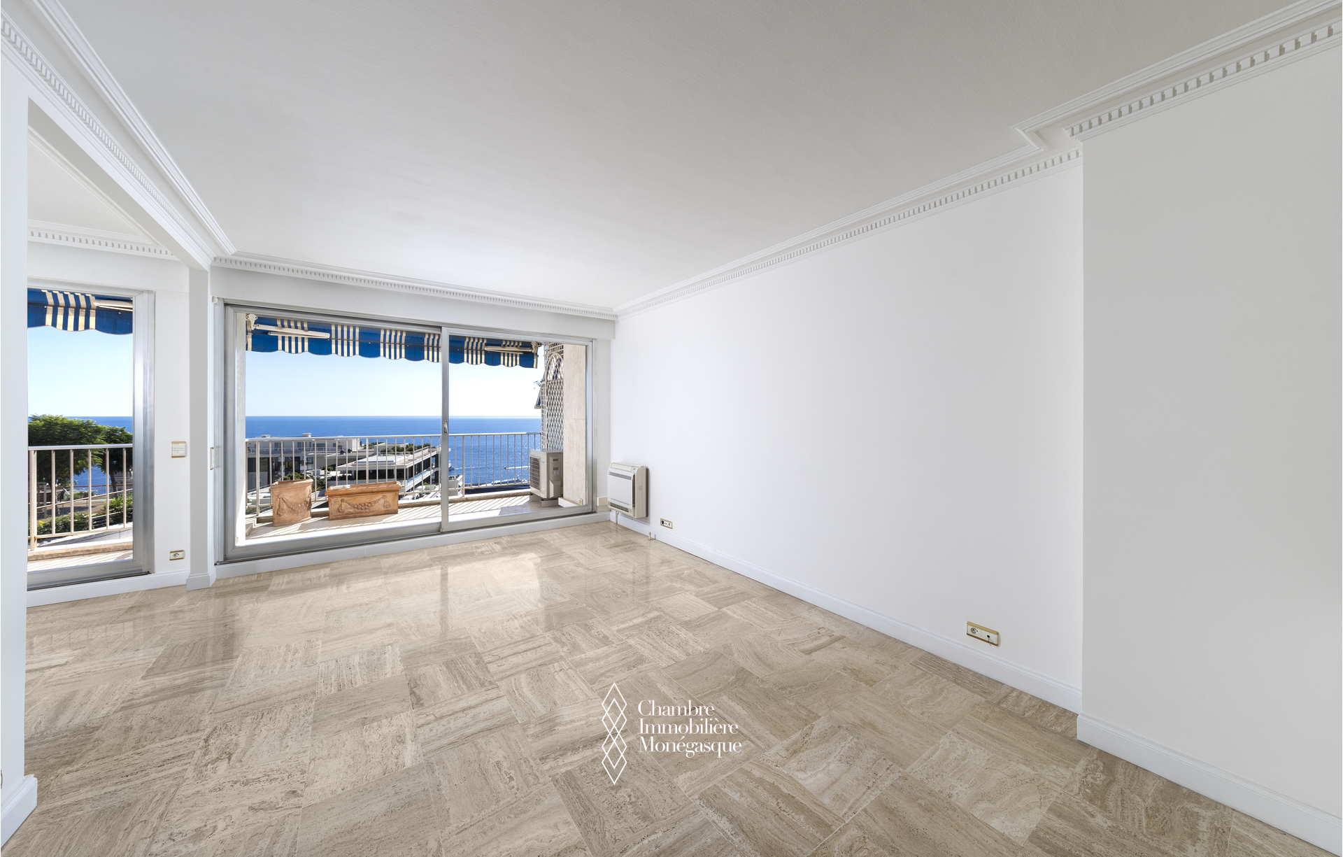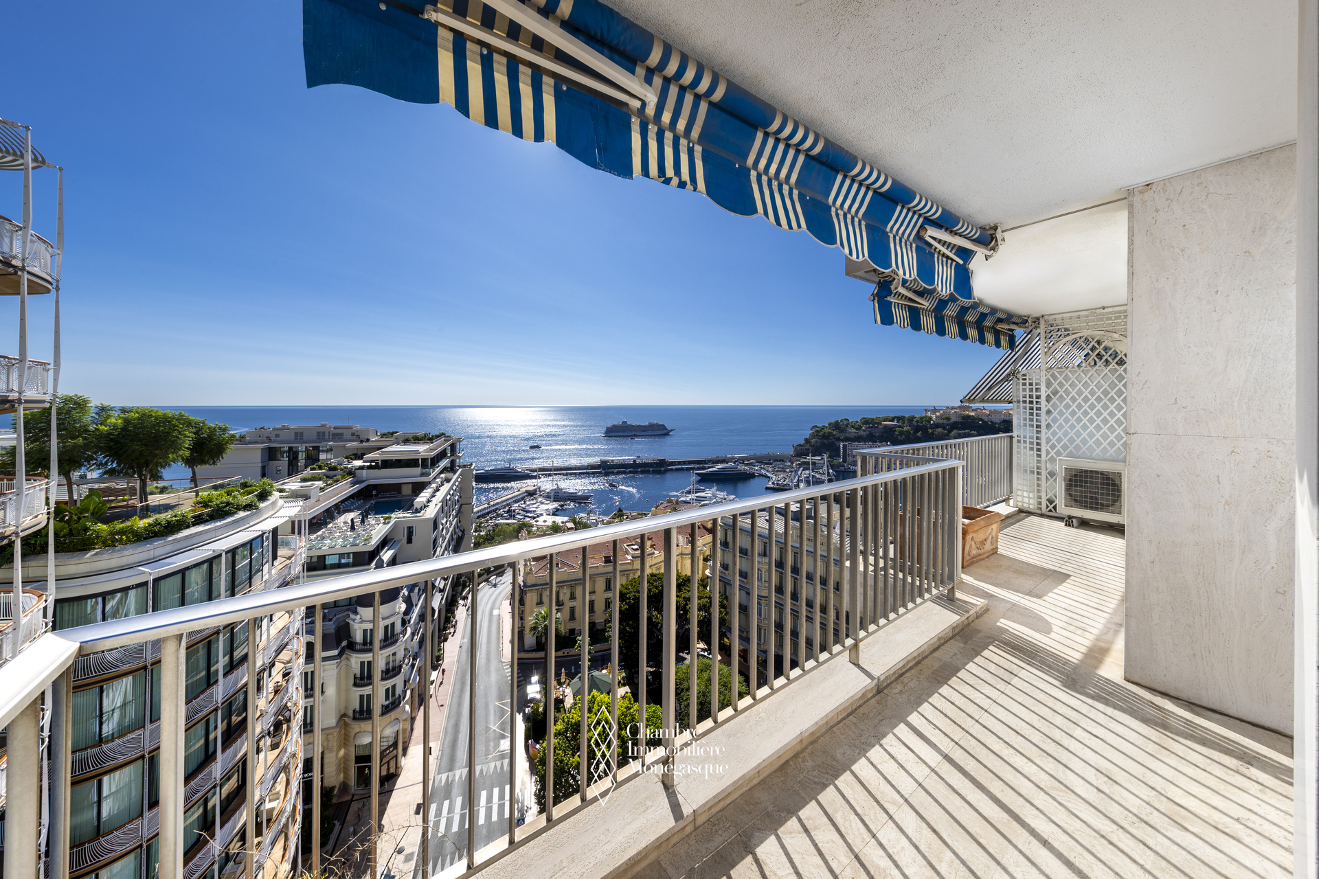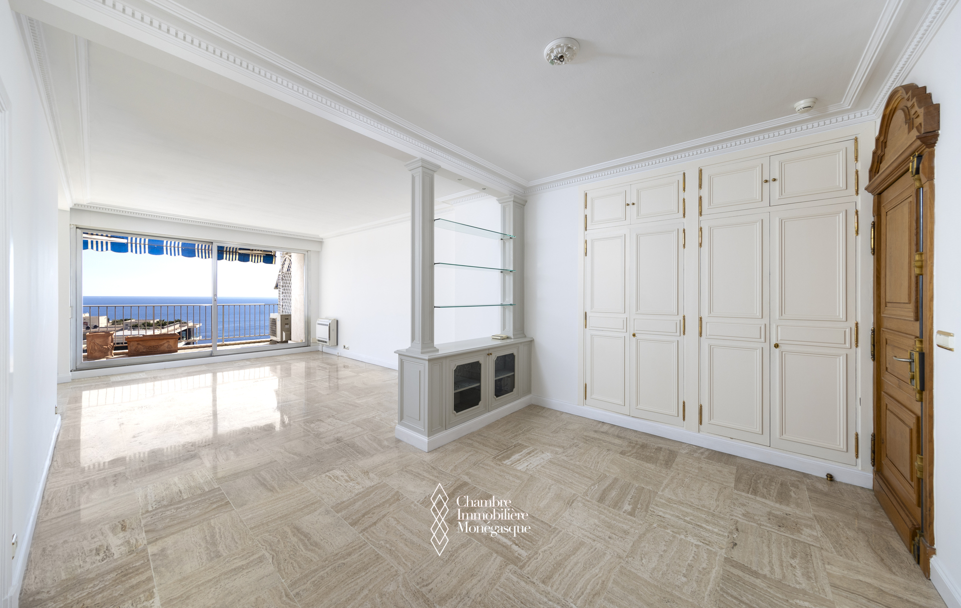 Carré d'Or - Le Sun Tower - 2 pièces Dans un immeuble de standing du Carré d'Or, Bel appartement de 2 pièces situé au 11ème étage. Vue panoramique sur la mer, le port et le rocher de Monaco. Surface totale de 108m². L'appartement se compose de : - Un hall d'entrée, - Un séjour/salle à manger ouvrant sur terrasse, Une chambre avec salle de bain complète, dressing, - Une cuisine équipée, Terrasse Circulaire.  Climatisation. Exposition Sud Ouest.
