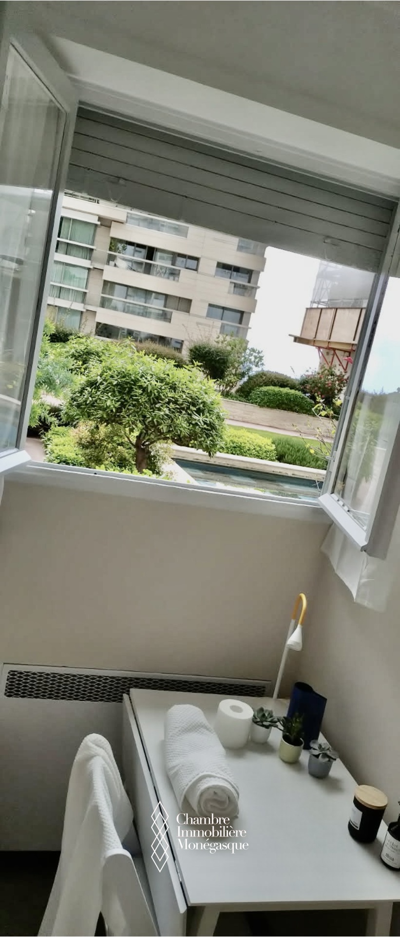 La chambre de service n°12  est très agréable grâce à sa vue sur le jardin et la fontaine de la résidence.
