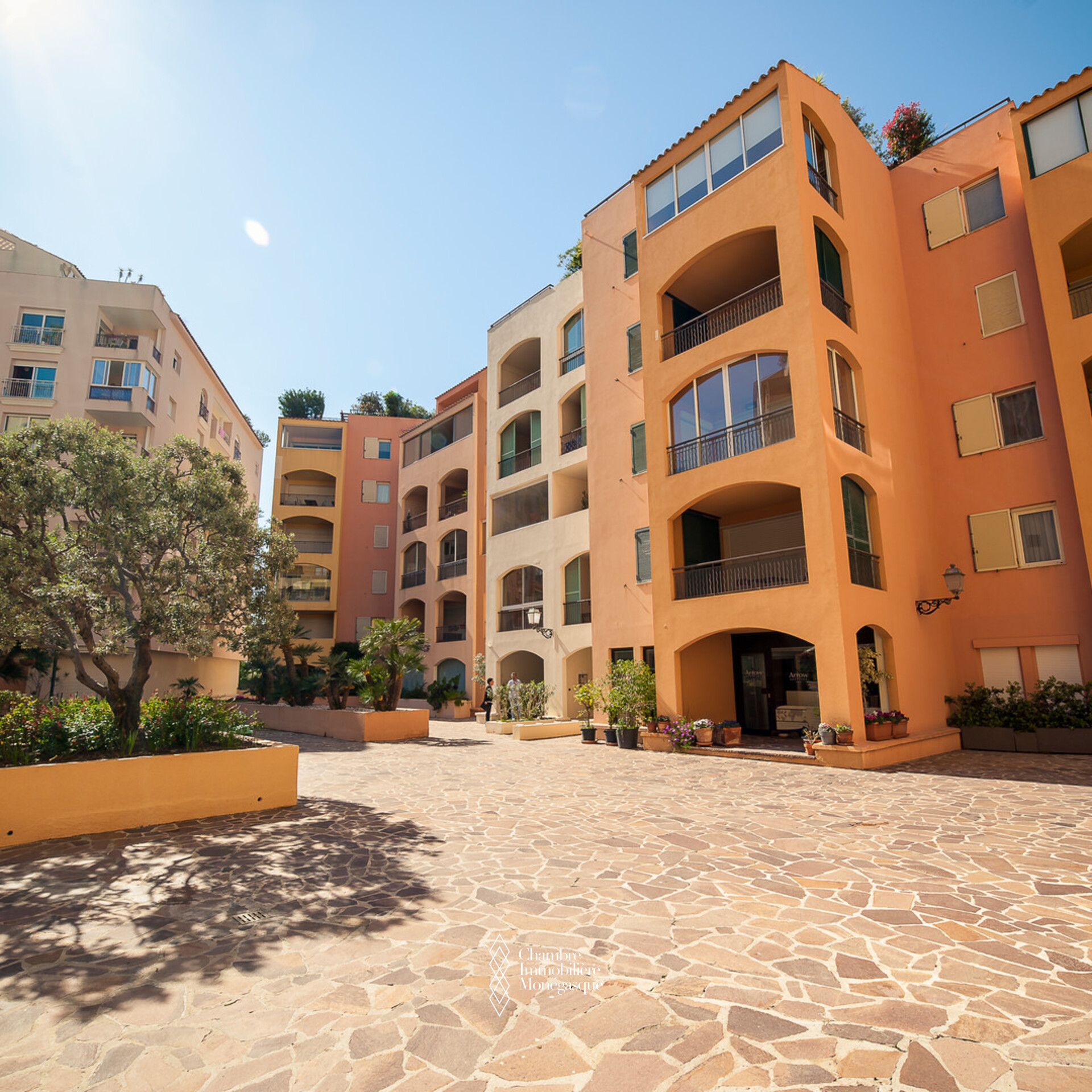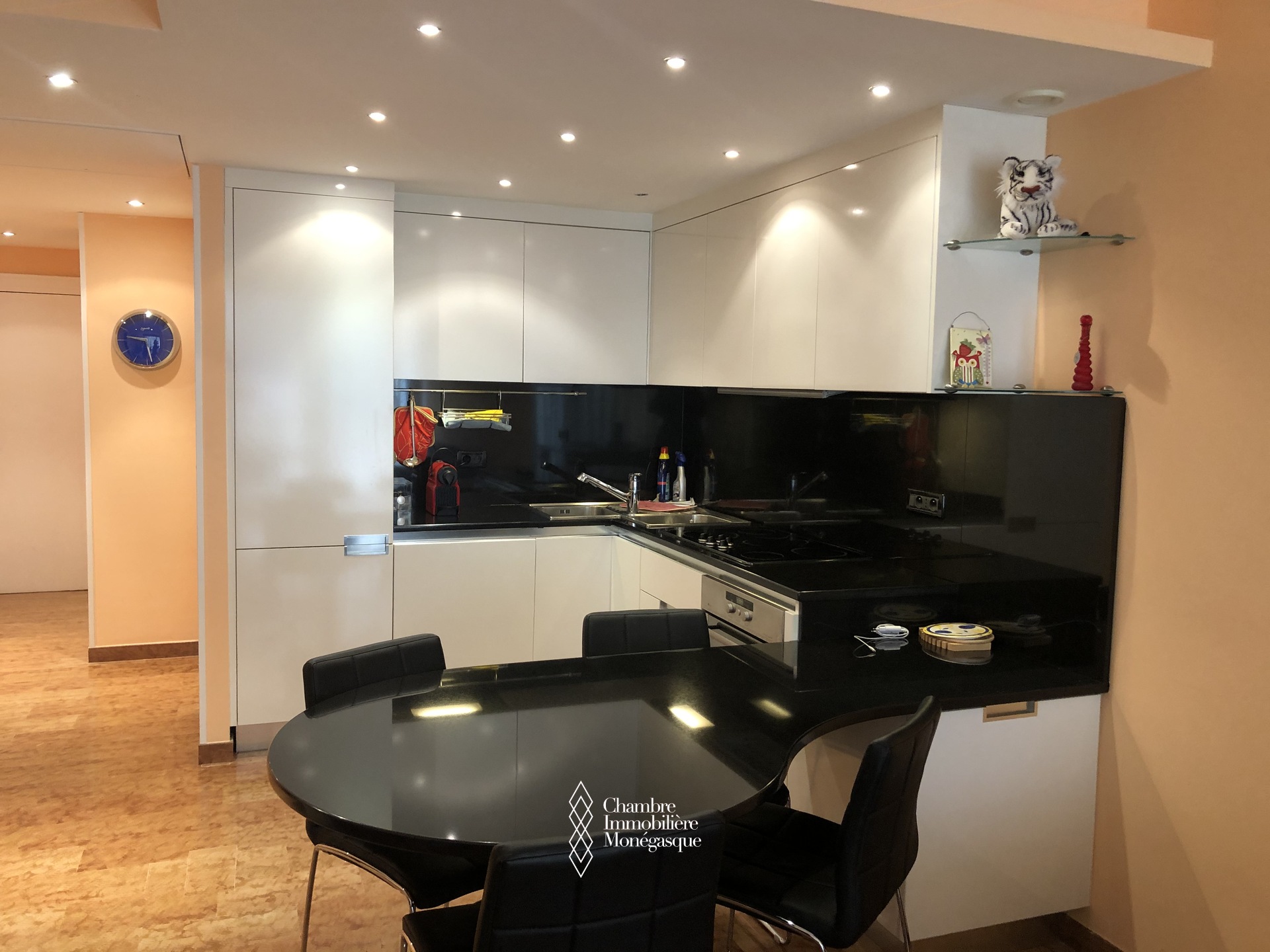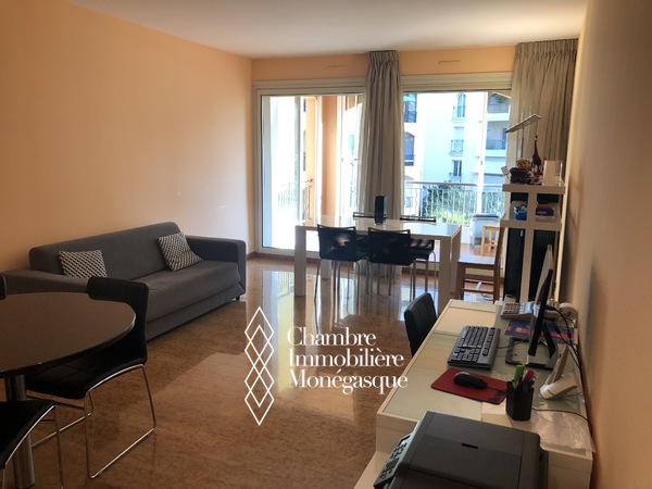 A Fontvieille, dans un quartier calme, beau 2P de 87 m² env.  en excellent état. Il est composé d'une entrée avec placard, toilettes invités, grande cuisine américaine dans séjour donnant sur loggia.