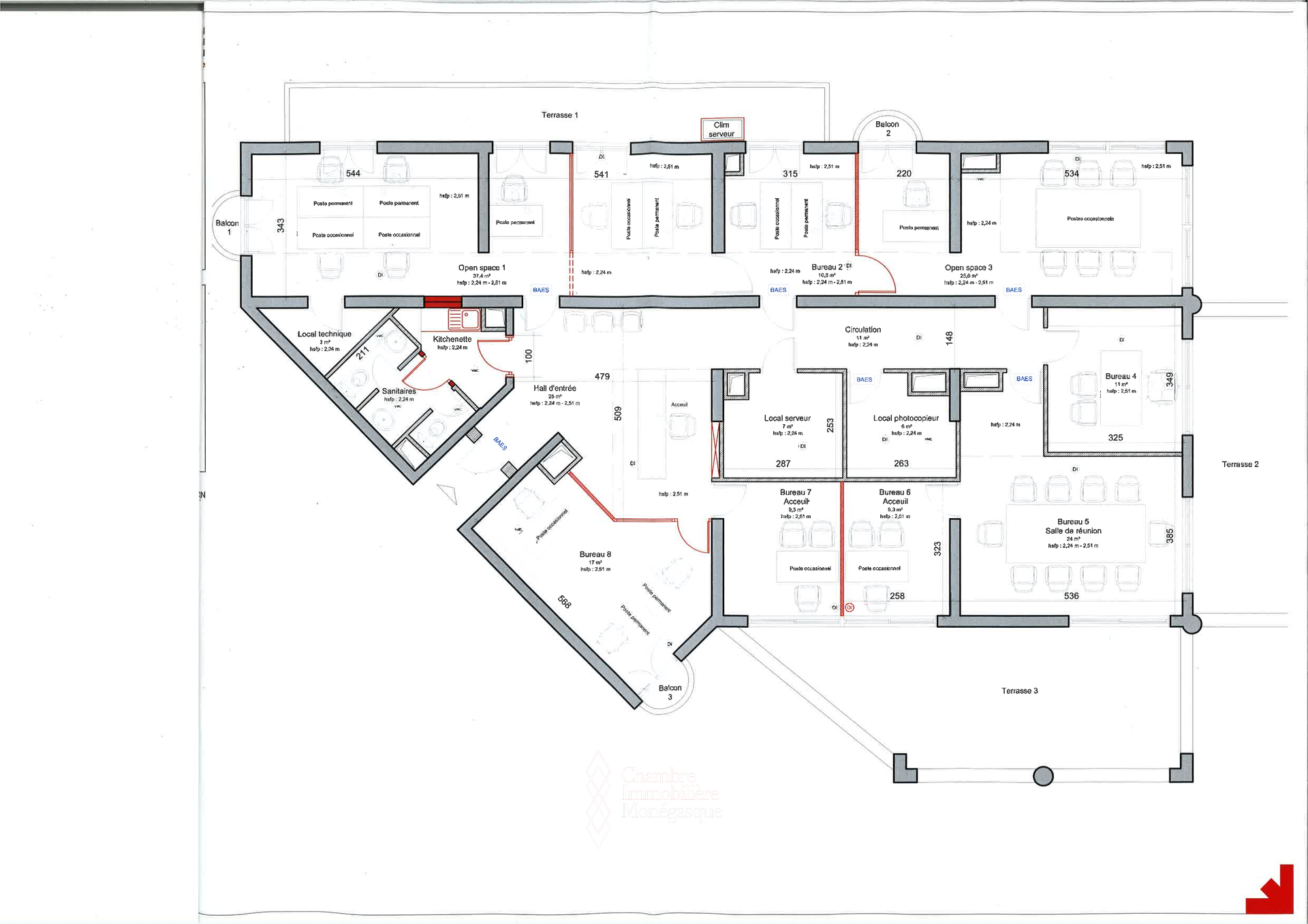 Kitchenette, 2 sanitaires, local technique, local serveur, local photocopieur,