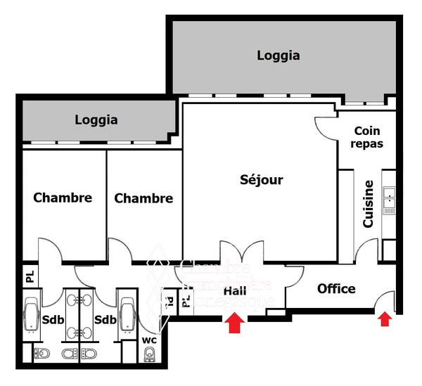 Hall d'entrée, office, cuisine équipée avec coin repas, séjour, deux chambre, deux salles de bains, toilettes invités, nombreux rangements, loggias