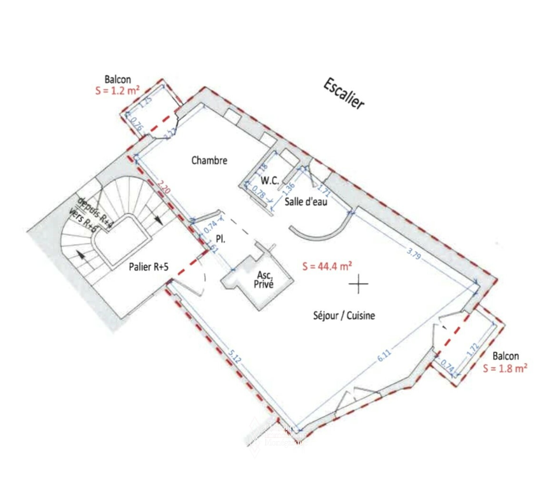 Il se compose de : une entrée avec rangements, un séjour avec une cuisine équipée le tout ouvrant sur une terrasse avec une vue sur le Casino, une chambre, une salle de douche complète, un ascenseur privé menant au dernier étage, une pièce donnant sur une large terrasse avec véranda.