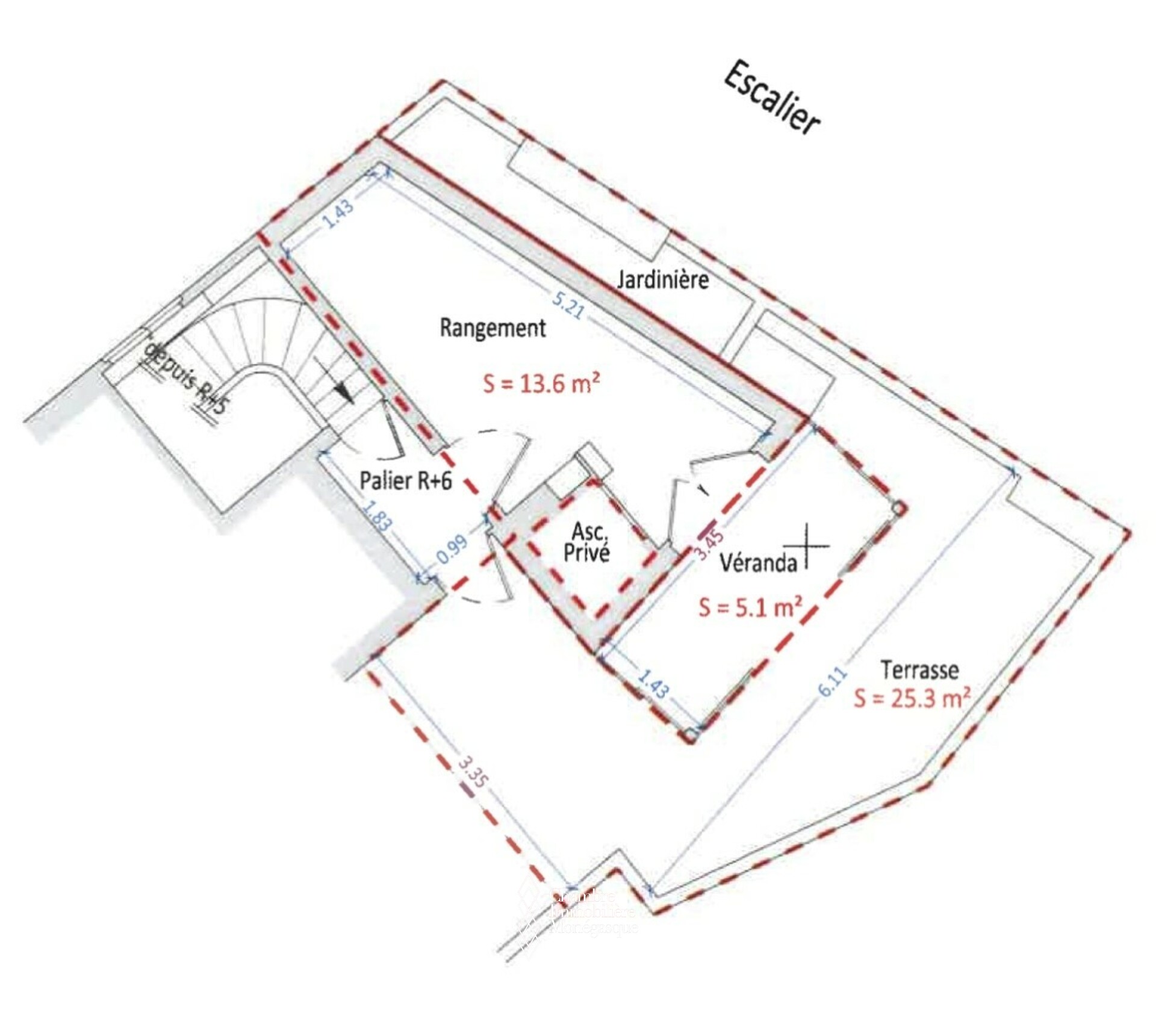 Ce duplex roof exposé sud d'une surface totale de 84 m² bénéficie d'un toit-terrasse aménagé d'une véranda et jouit d'une vue mer.