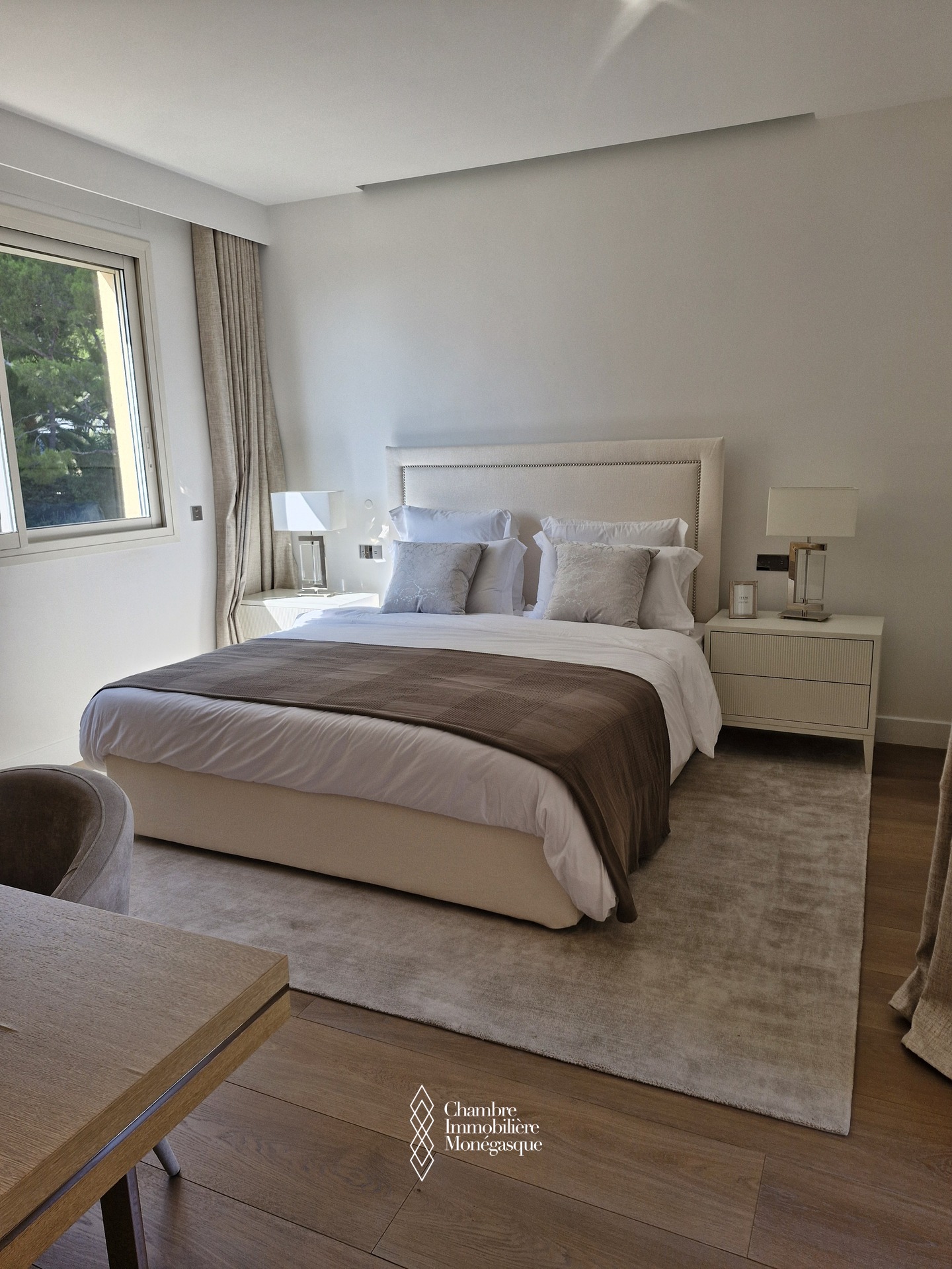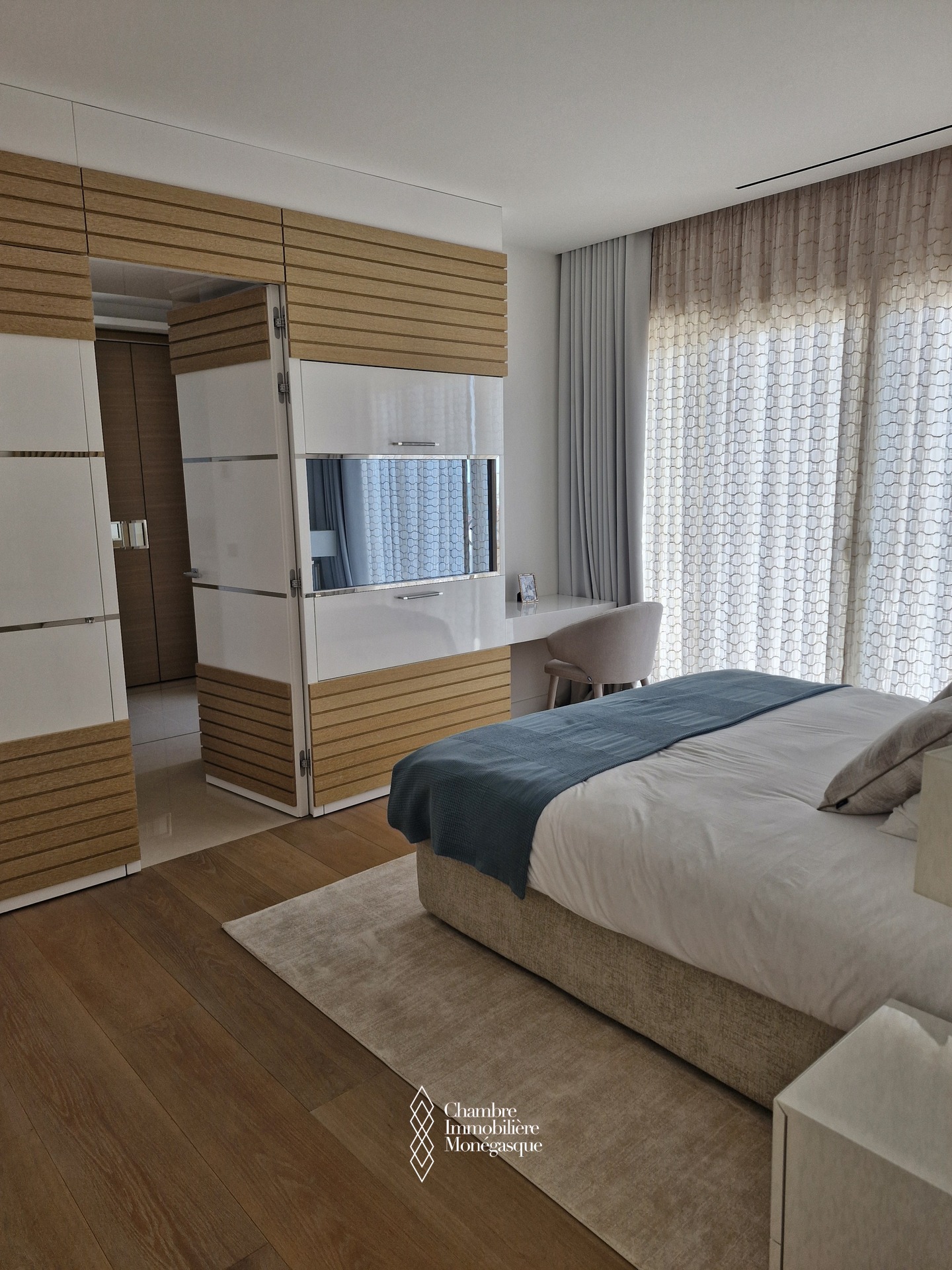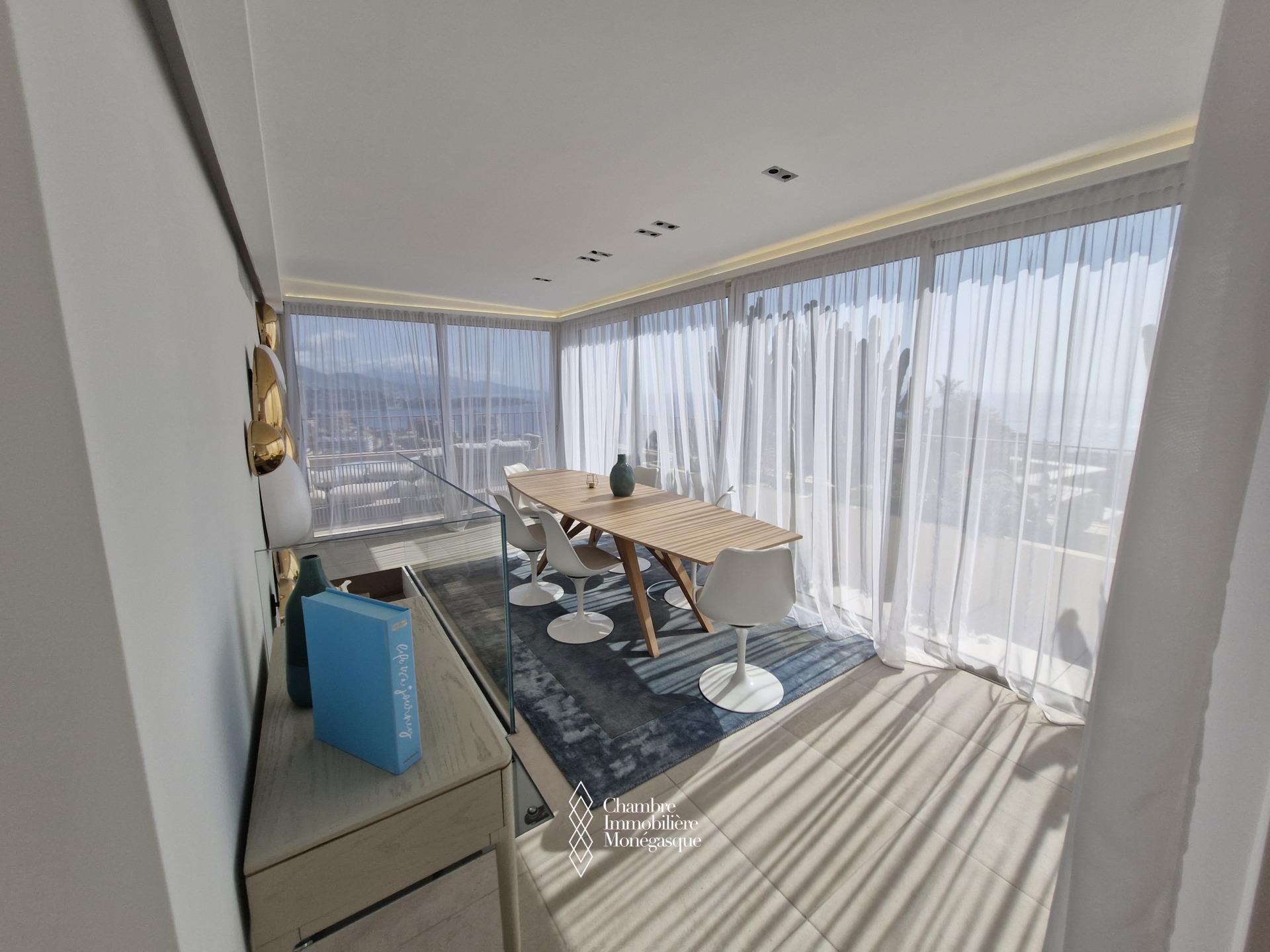 L'appartamento è direttamente accessibile da un ascensore privato ed è composto al 5° piano da un luminoso soggiorno con cucina a vista completamente attrezzata e un'isola centrale. Questa camera si apre su un ampio terrazzo arredato con una vista mozzafiato sul principato. Camere in -