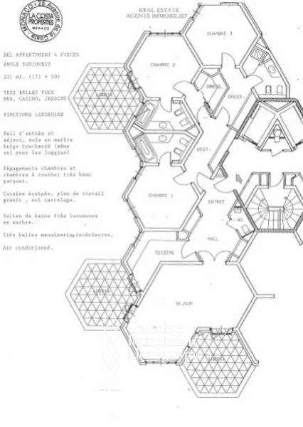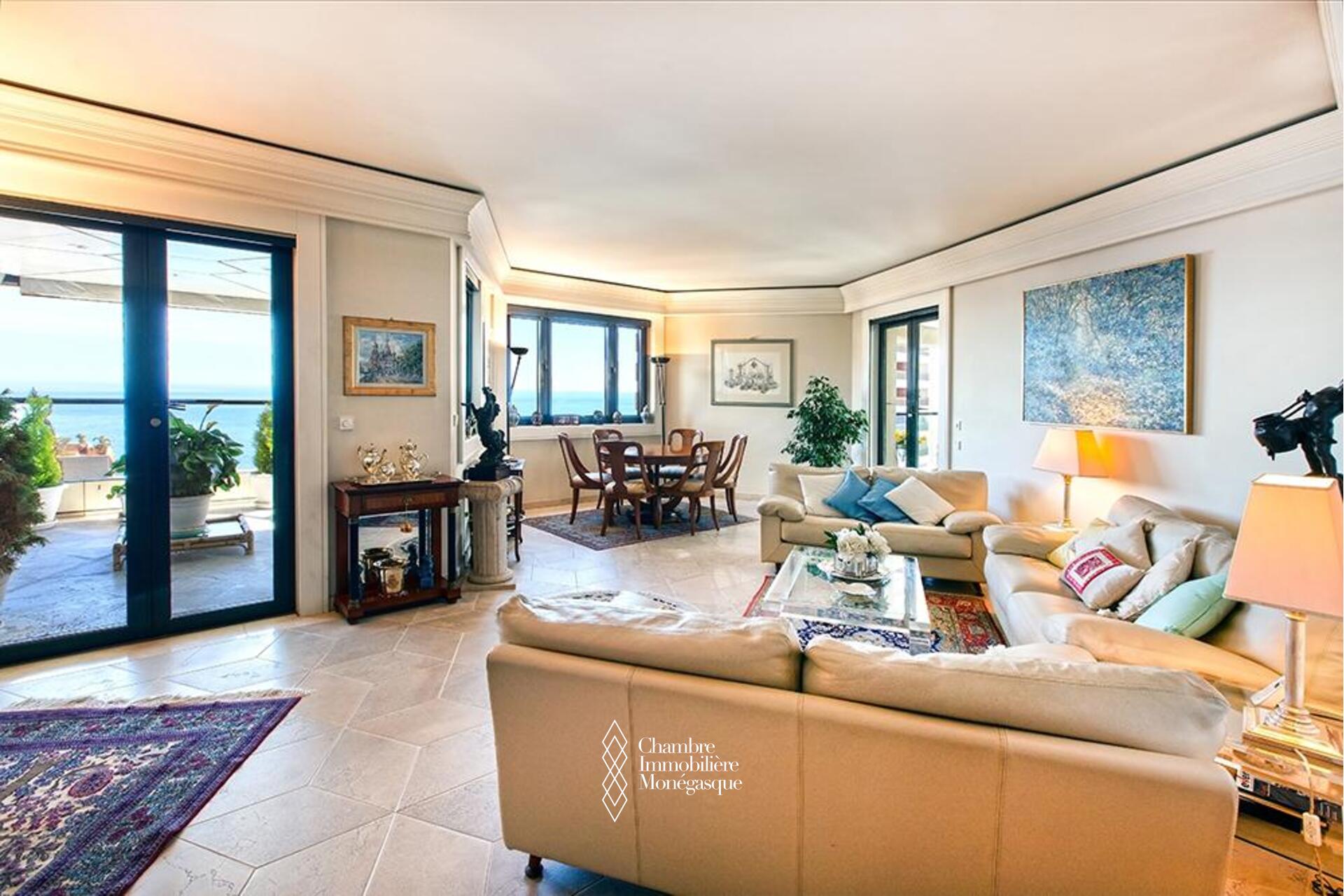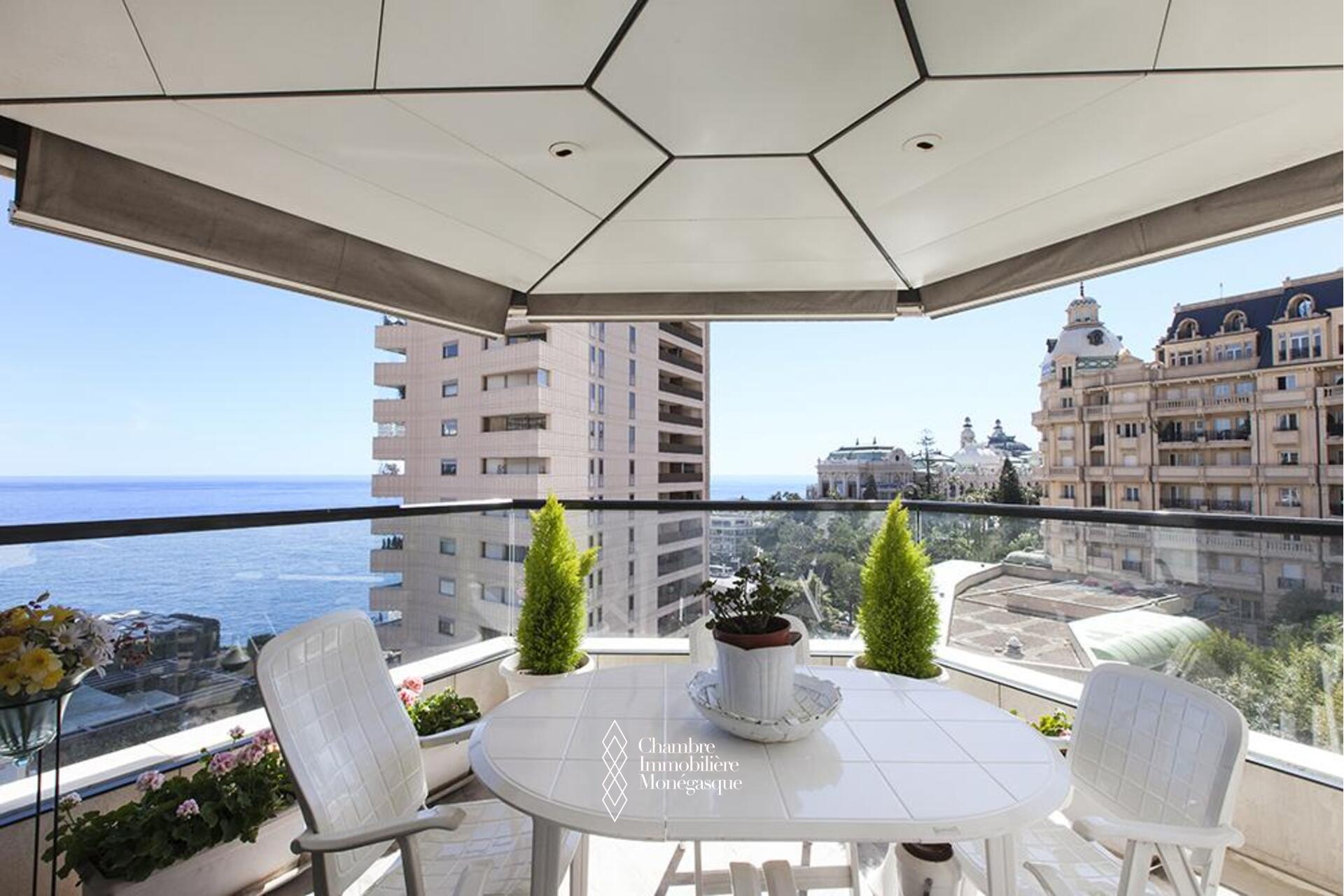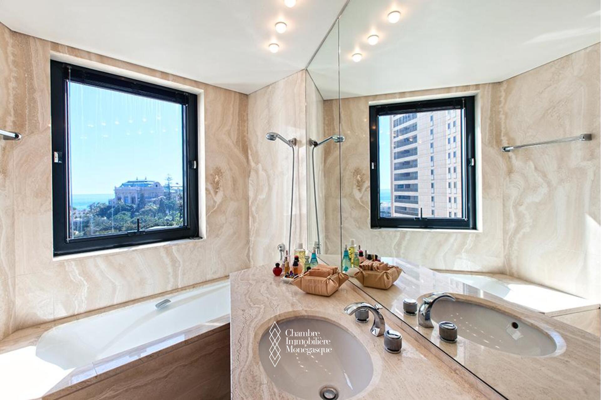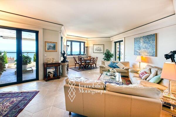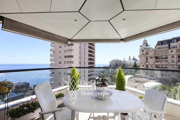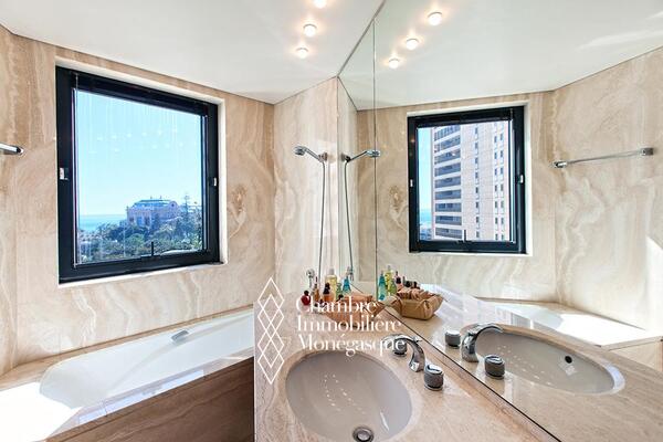 Questo appartamento è situato in posizione ideale nel cuore del Carré d'Or, tra i giardini del Casinò e le spiagge, in un lussuoso palazzo dotato di servizio di sicurezza. L'appartamento è composto da un ingresso con armadi a muro e un bagno per gli ospiti; un doppio soggiorno che si apre su un'ampia terrazza fronte mare, una cucina completamente attrezzata che si apre anch'essa su una loggia, due ampie camere da letto con cabina armadio e bagno privato, una camera da letto con bagno privato con doccia, numerosi armadi a muro.