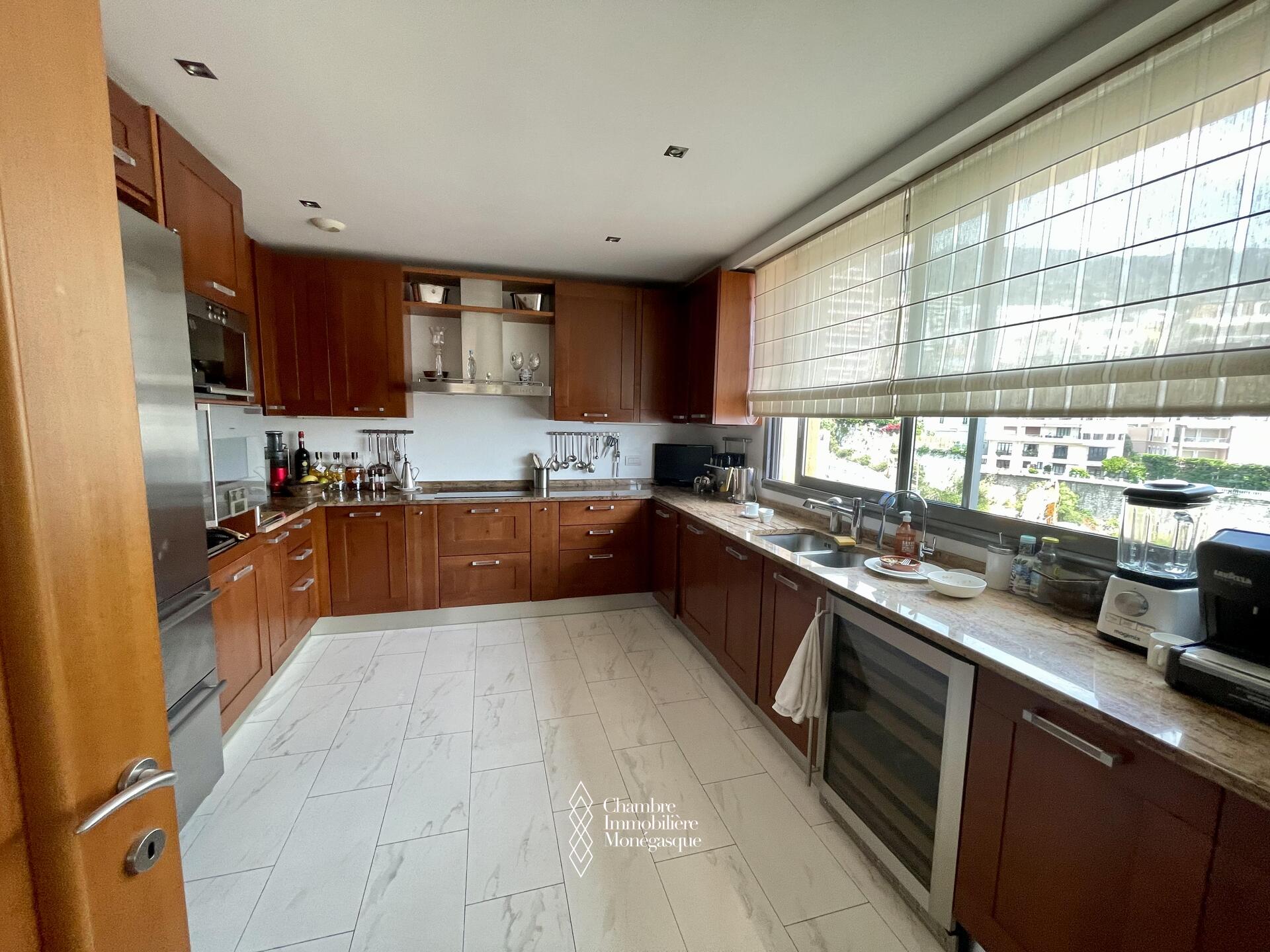 La zona giorno comprende un elegante doppio soggiorno, con salotto e sala da pranzo, che si apre su un’ampia terrazza luminosa. Da qui si gode di un panorama unico e mozzafiato sul mare e sul porto Ercole, uno degli scenari più esclusivi di Monaco.