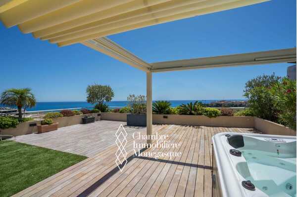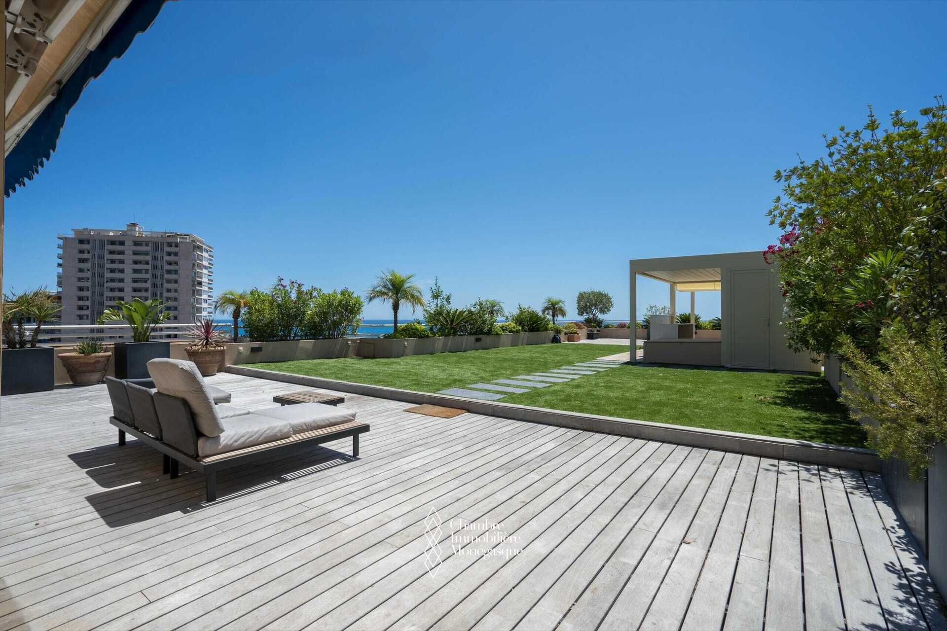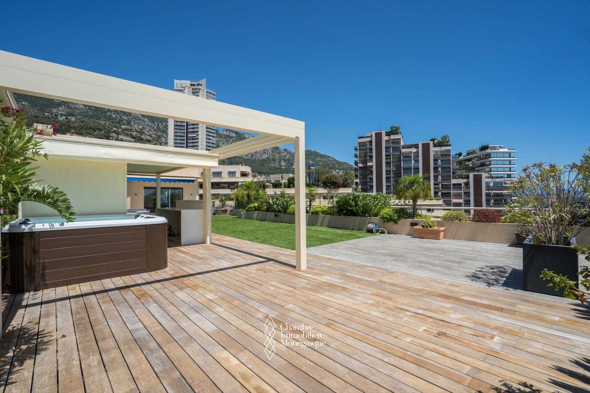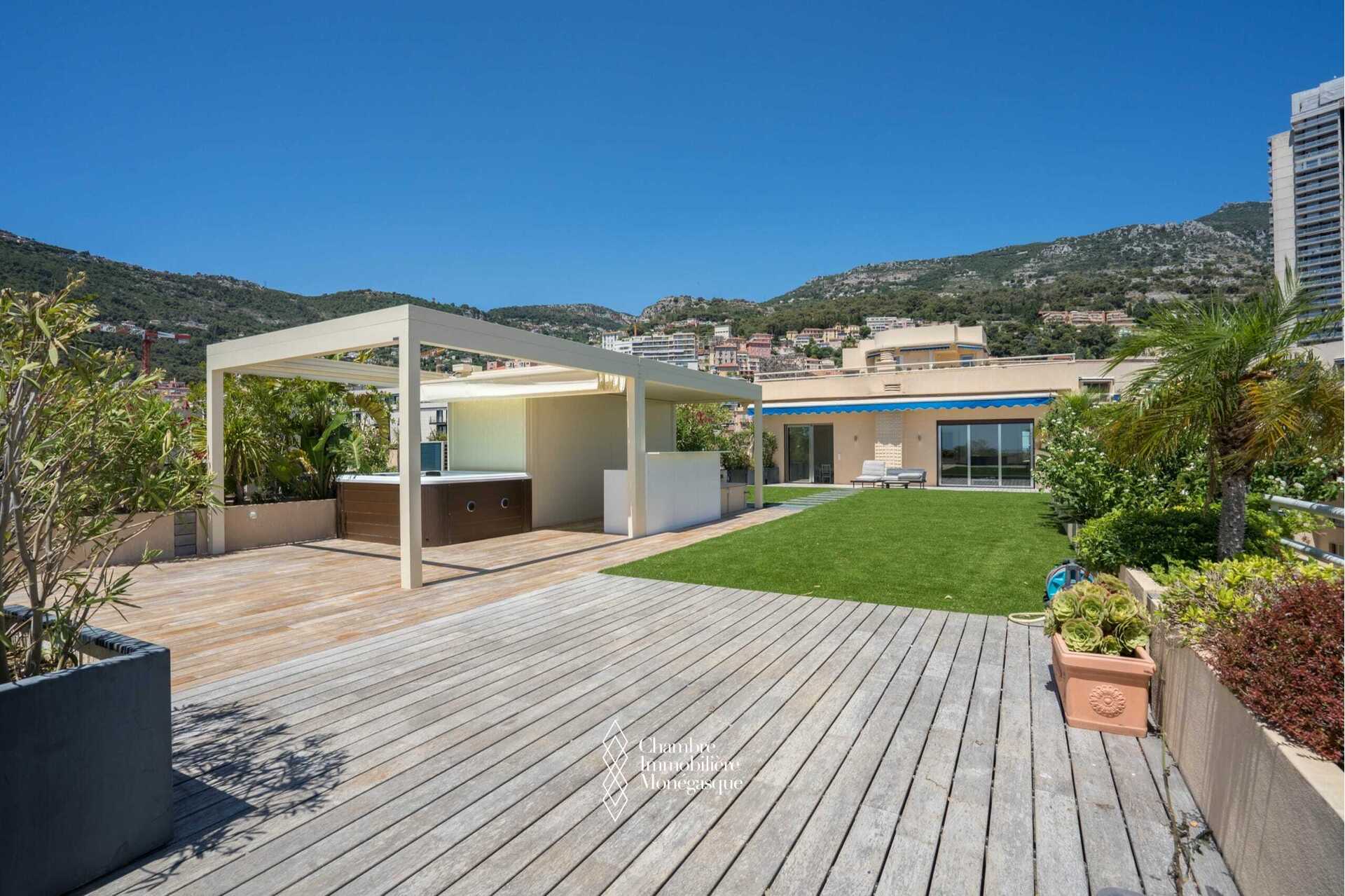 All’esterno, la terrazza di 85 mq si estende in un giardino privato di circa 225 mq, una caratteristica particolarmente rara nel cuore di Monaco. Questo spazio, dotato di cucina estiva e spa, crea una vera e propria area abitativa aggiuntiva, ideale sia per il relax che per ricevere.