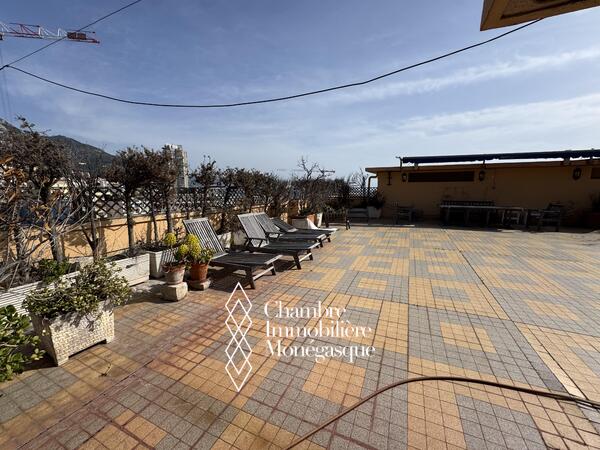 Situato nel cuore dell'area residenziale del Giardino Esotico, il Palazzo Franzido gode di un ambiente tranquillo e privilegiato, con vista sul Principato. L'area offre accesso diretto a tutti i servizi: fermate degli autobus ai piedi dell'edificio, immediata vicinanza alla nuova stazione ferroviaria e ascensore pubblico che collega direttamente al porto di Monaco. L'edificio offre servizi di lusso con ascensore e servizio di concierge. Un doppio parcheggio situato nella residenza vicina "Les Oliviers", anch'esso sicuro e dotato di portineria, completa questa rara proprietà in affitto. L'appartamento offerto è un grande duplex di 5 stanze principali che occupano gli ultimi due livelli dell'edificio. Con un'area abitativa di circa 185 m², seduce con i suoi volumi generosi e la sua terrazza privata sul tetto di 192 m², offrendo una vista panoramica eccezionale sul mare, sulla città e sulle montagne. Il complesso ha una superficie totale di quasi 388 m², inclusi balconi e spazi all'aperto. Situata su un piano alto e condividendo il pianerottolo con un solo altro appartamento, unisce rarità, tranquillità e comfort abitativo.