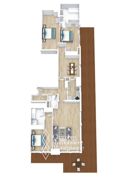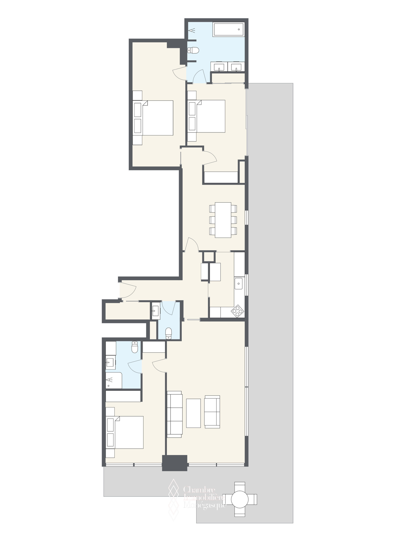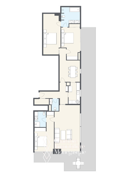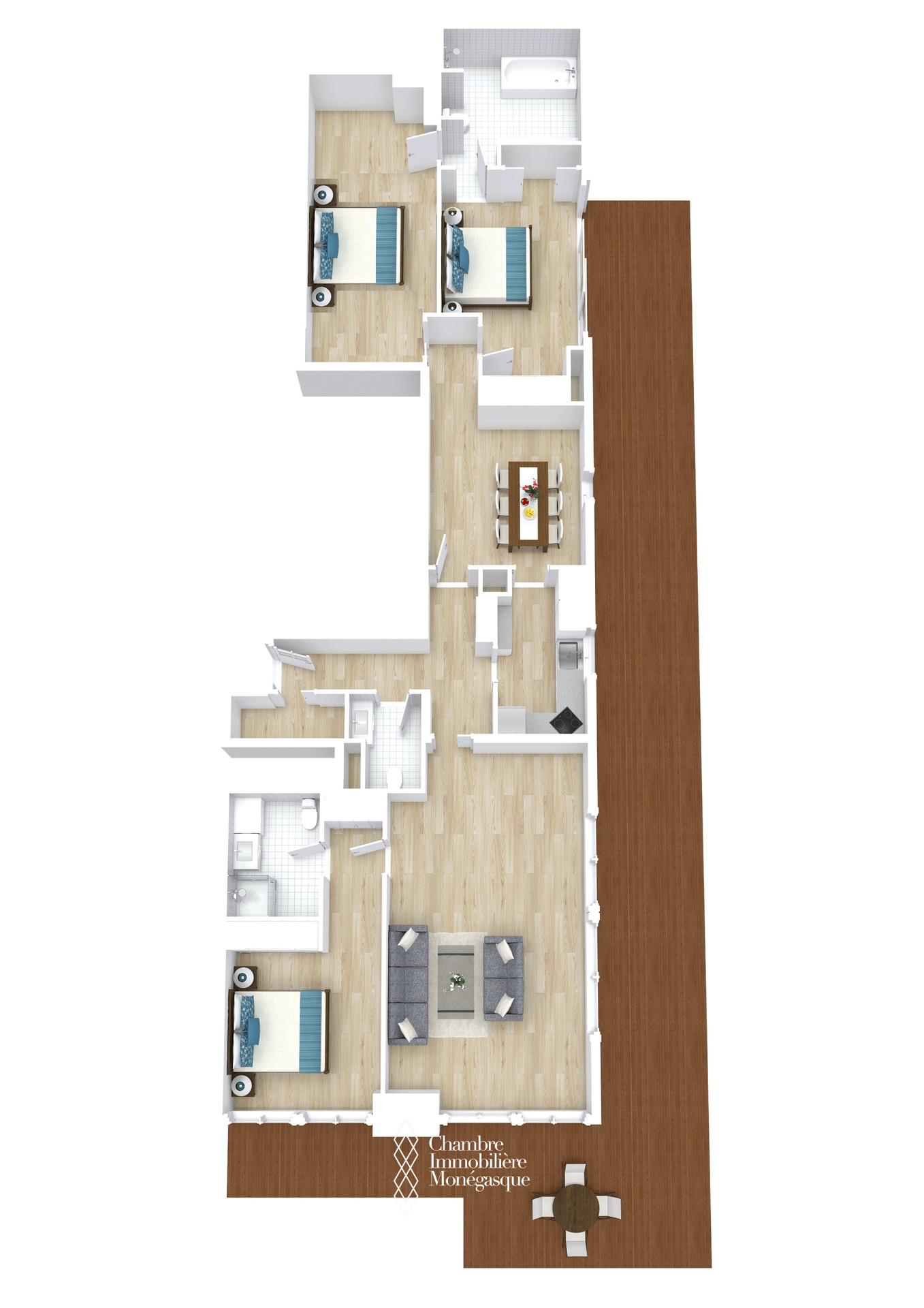 L’appartement se compose d’un vaste hall d’entrée, d’un spacieux séjour et salle à manger ouvrant sur de larges terrasses avec une vue imprenable, ainsi que d’une cuisine contemporaine entièrement équipée. L’espace nuit comprend trois belles chambres, ainsi que deux salles de bains luxueuses aux finitions haut de gamme.